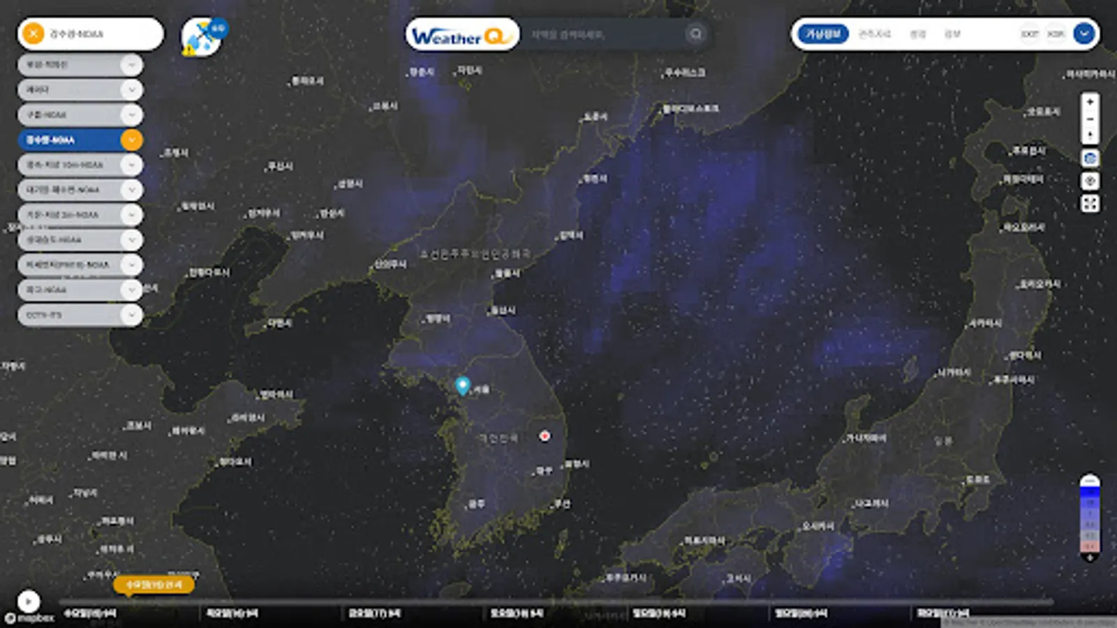 ∙ You can select satellite, radar, cloud, precipitation, rain shower, precipitation intensity, snow depth, wind speed, atmospheric pressure (sea level), temperature, relative humidity, fine dust, and wave height forecast.