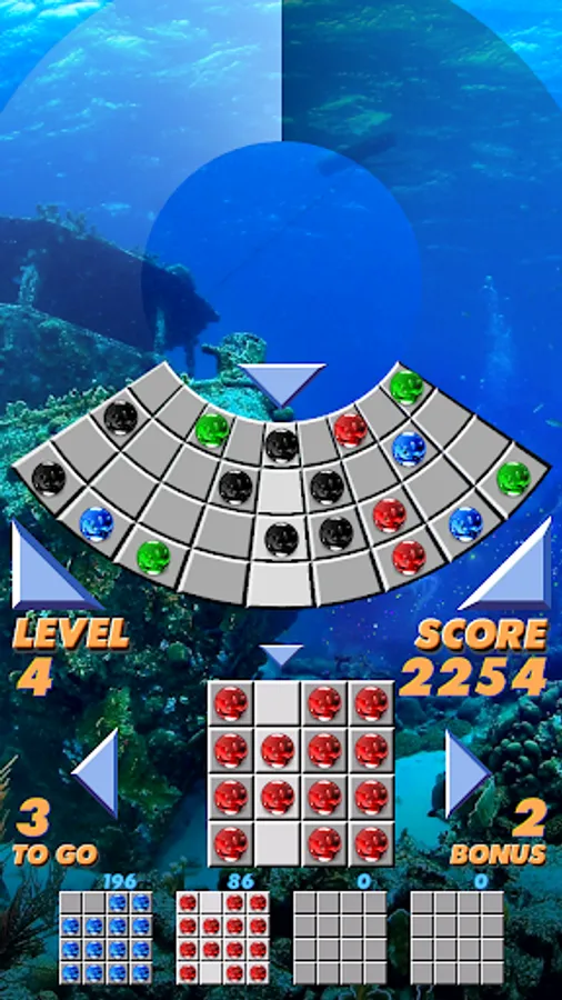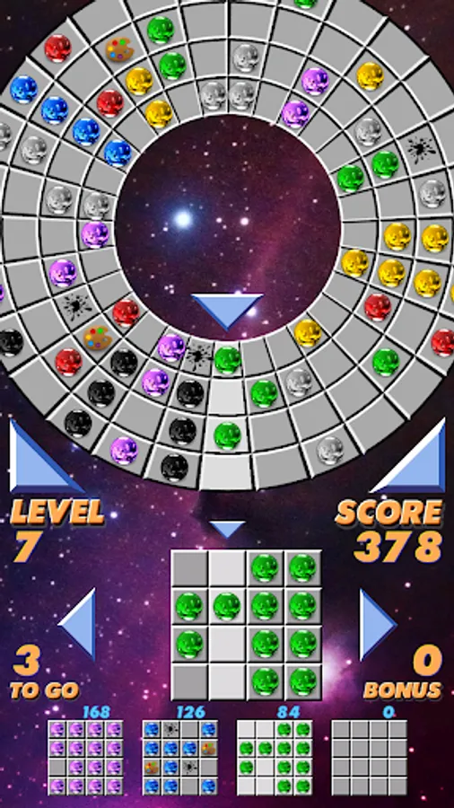 Two special items may appear after level 5, the palette, and the blot. Drop the palette to change a ball to the color dominating the rest of the grid. Drop the blot onto a ball to remove it from the grid.