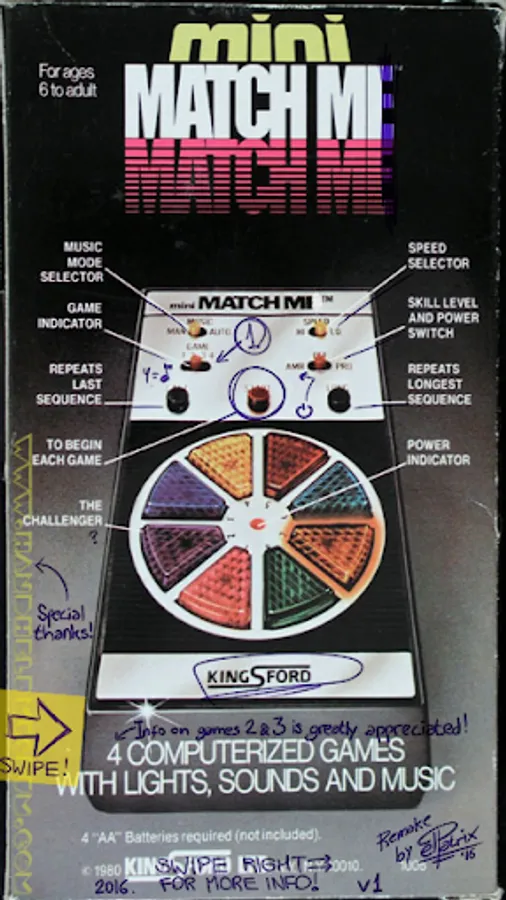This is a digital remake of the electronic "Simon" game called mini MATCH ME™, manufactured by KINGSFORD in the 80's. All functionality is based solely on what I remember from playing it; because I no longer have the original.
