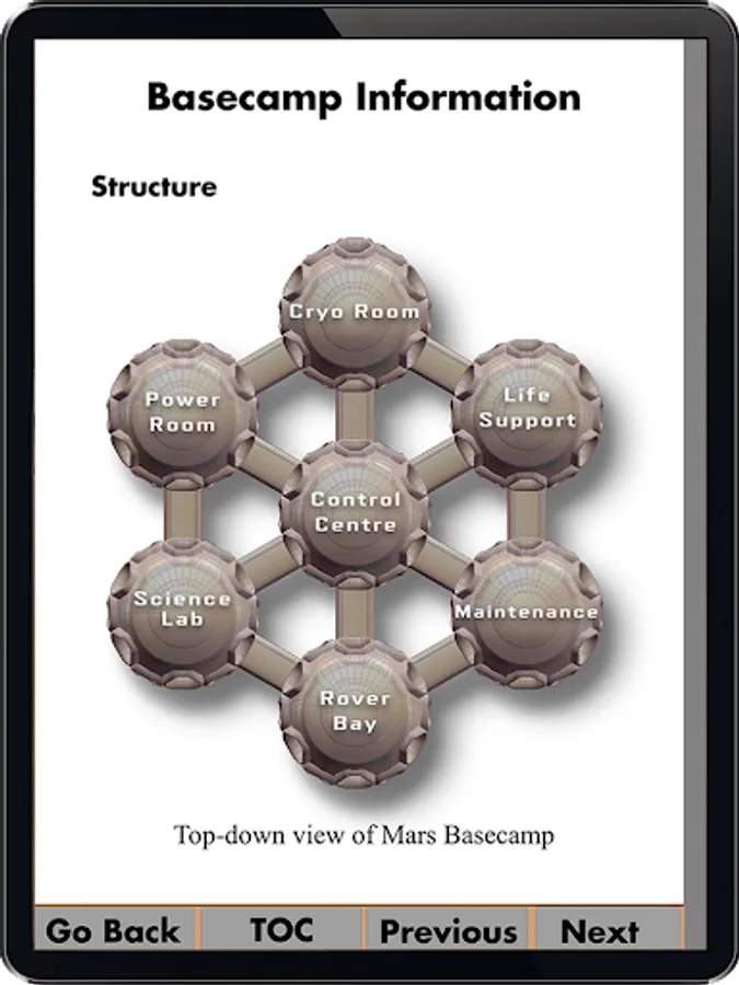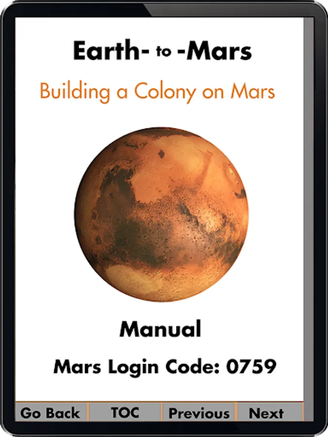 Earth-to-Mars is designed for two-player interaction. While one player experiences the Mars-base environment in virtual reality, the other runs Earth’s Mission Control from the tablet.