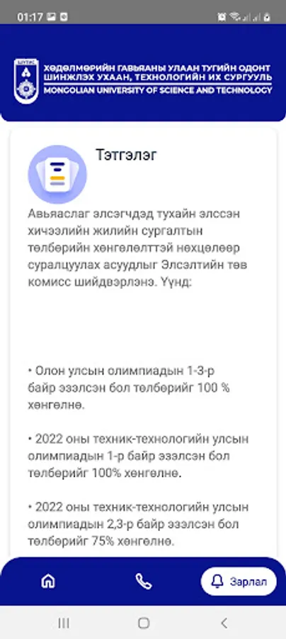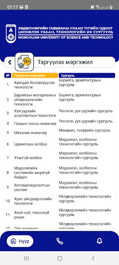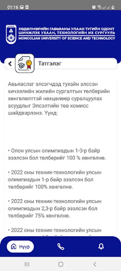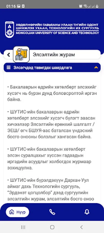 Information on the admission to undergraduate/bachelor programs of the Mongolian University of Science and Technology are all can be found in this application secondary school students. The structure of this application is: