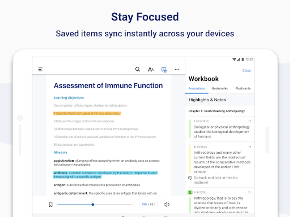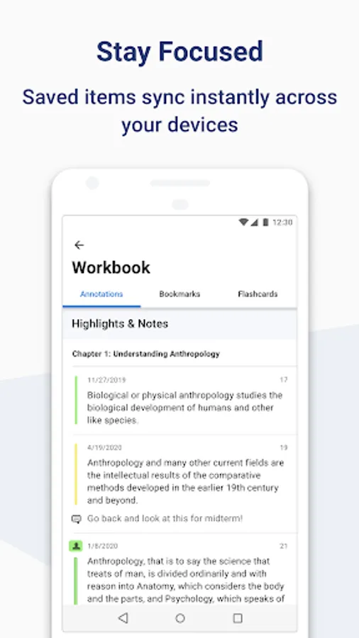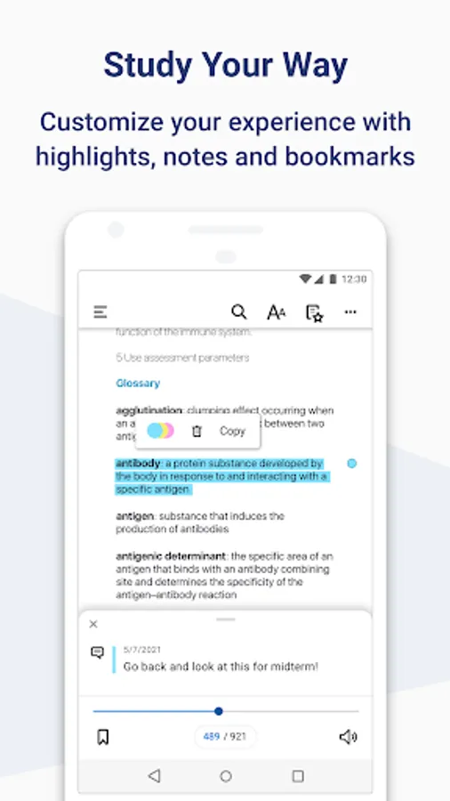 • Select text to create notes or highlights from your mobile device.