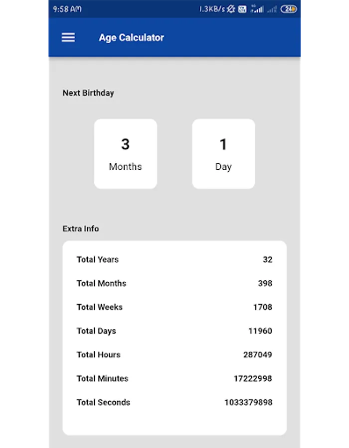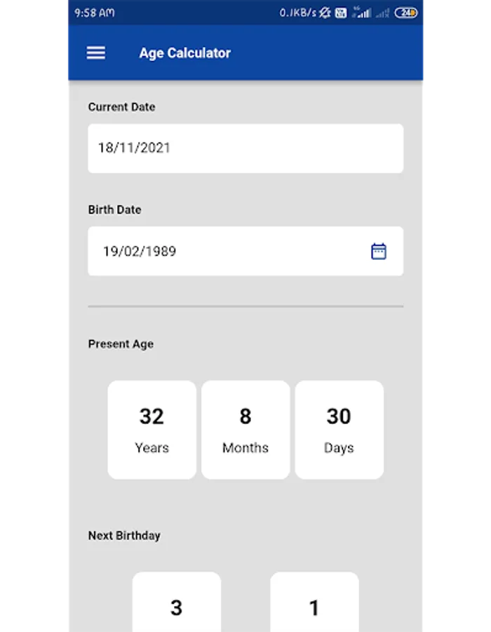 Android and IOS Compatible Android Mobile App: Built on Flutter 2 NullSafety with Beautiful Material Design also Login/Signup by Email-Password Age Calculator with Details Calculate Next Birthday Add Reminders on Birthday Days Count Dates Reminders Lists and Update/Delete Scheduled Notifications on Event Time Responsive in Any Device Developer Friendly Free Update Easily Customizable Well Commented Code