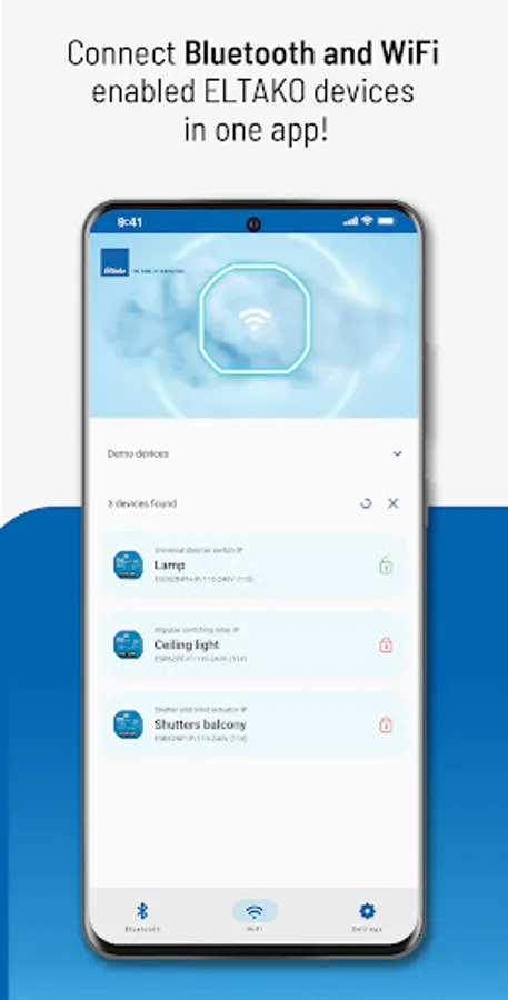 With our app you can control Bluetooth and WiFi enabled ELTAKO devices. The modern user interface follows the motto "The simpler the operation, the more convenient the use". By regularly updating and constantly expanding product compatibility, Eltako Connect remains the status-quo of technological progress.
