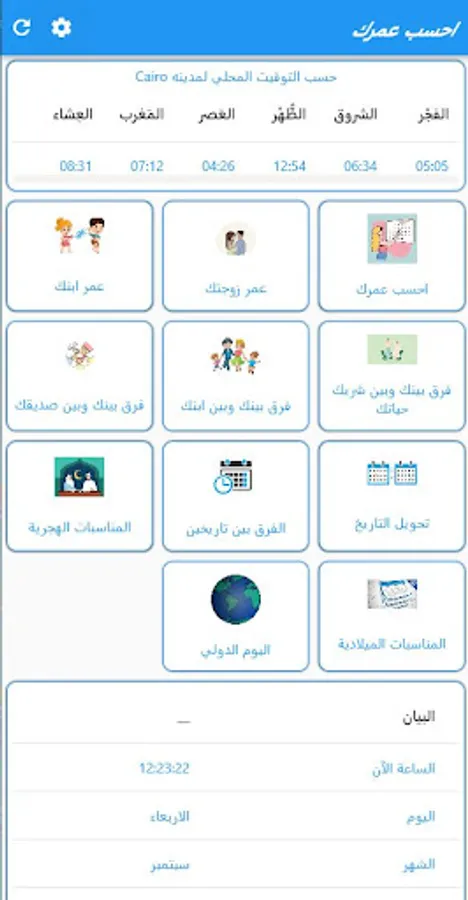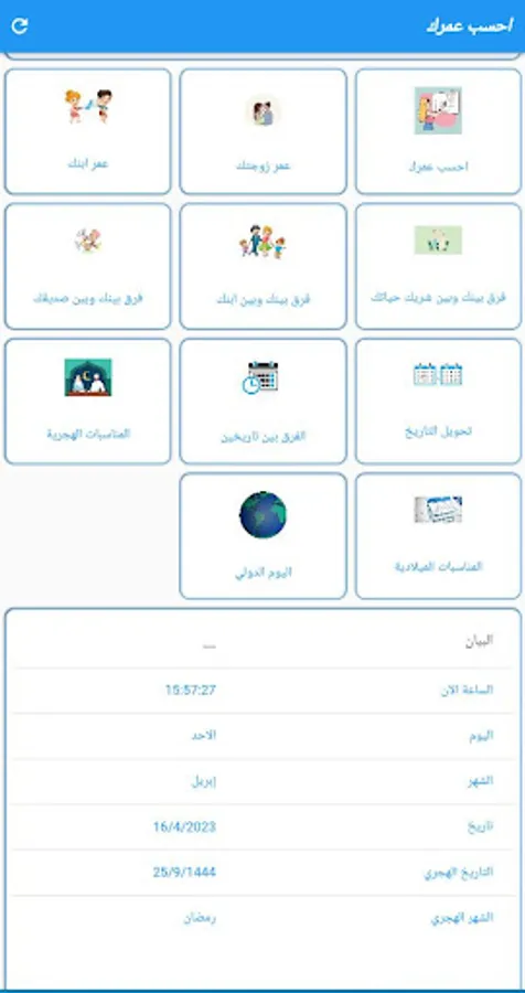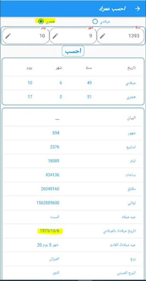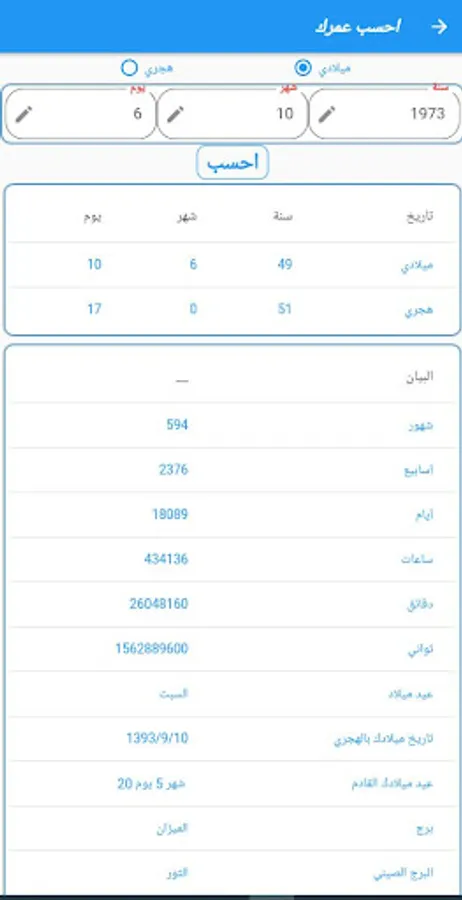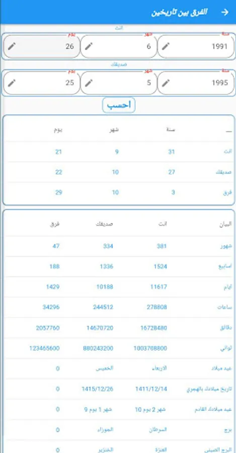 - Calculating the age in seconds, minutes, hours, days, weeks, months and years and knowing the second date (Gregorian or Hijri)