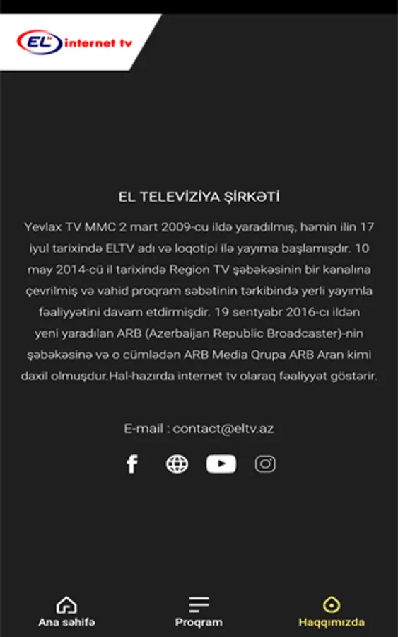 Yevlakh TV LLC was established on March 2, 2009 and started broadcasting on July 17 of the same year under the name and logo of ELTV. On May 10, 2014, it became a channel of the Region TV network and continued to operate with local broadcasting as part of a single program basket. On September 19, 2016, it joined the network of the newly established ARB (Azerbaijan Republic Broadcaster), including the ARB Media Group, as ARB Aran. ARB Aran, which used to broadcast around 14-18 hours a day, now broadcasts 24 hours a day. High-quality digital terrestrial broadcasting is carried out in the Central Aran region from two sources - on frequencies 24 and 59. The main purpose of the channel is to cover the events in the socio-economic and cultural life of the regions and cities covered by the broadcast, to improve the quality of information services provided to the population. Over the years, ARB Aran has significantly strengthened its position as a media outlet working for this purpose. The channel's audience includes viewers of all ages. ARB Aran has always tried to please the audience. Dozens of TV projects in various genres and colors have been prepared for this purpose. The company has services in "Transport and Supply", "Economy", "Technical and Broadcasting", "Projects". Established in 2016, Aran Film Creativity Center is engaged in the production of documentaries and feature films. The films are broadcast on the ARB network and the ARB 24 channel. At present, "Asgar" program is produced for network broadcasting on "ARB Aran" TV, and "Bu Sahar" and "Bankir" programs are produced for local broadcasting.