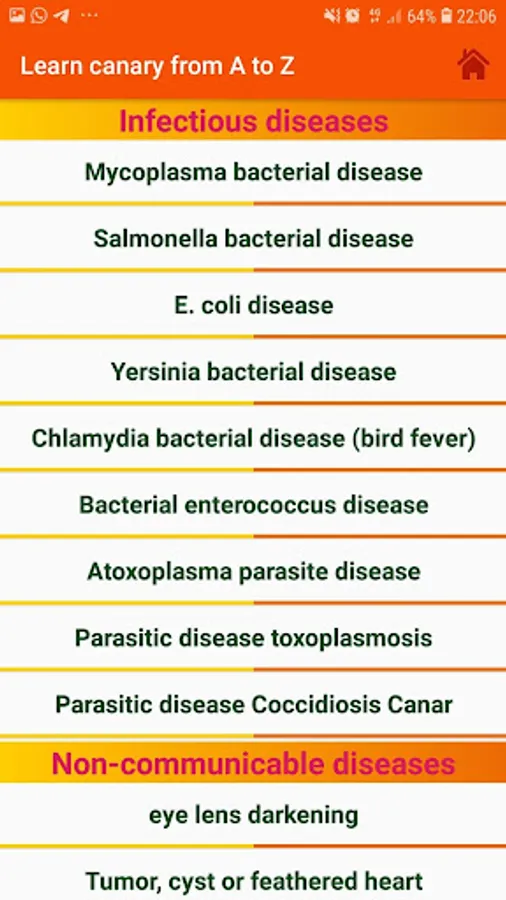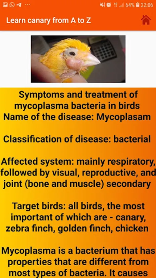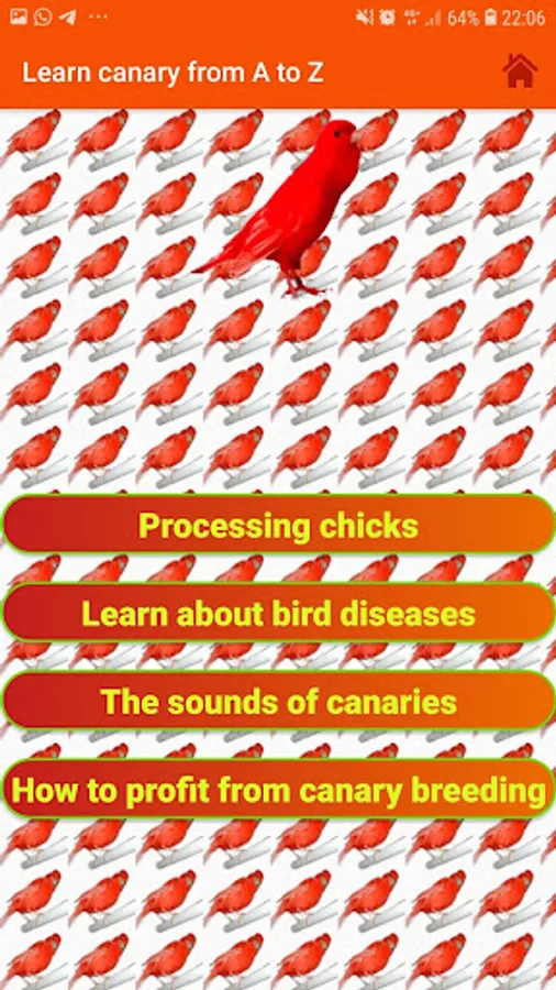 The application contains all kinds of diseases that affect canaries, whether infectious or non-infectious, and it also contains sounds for some canary birds that can help chicks to readiness