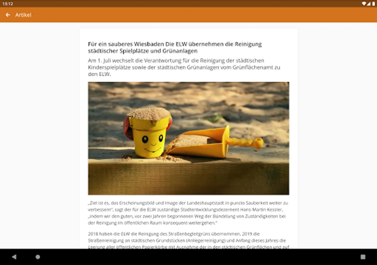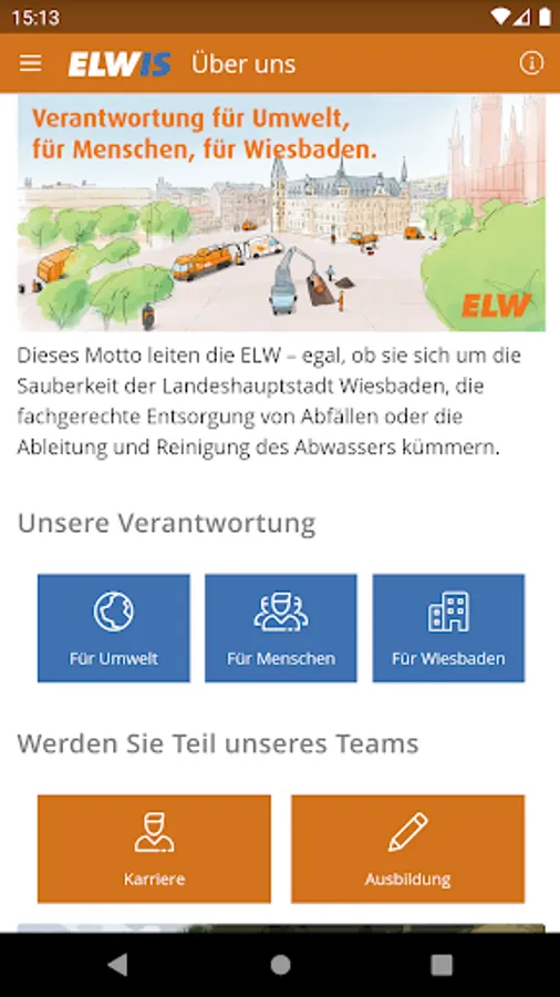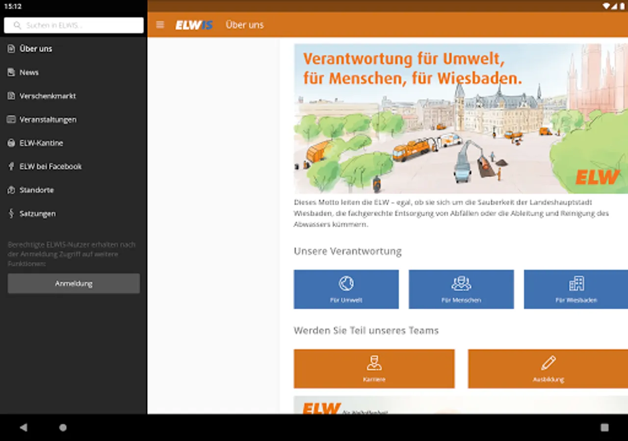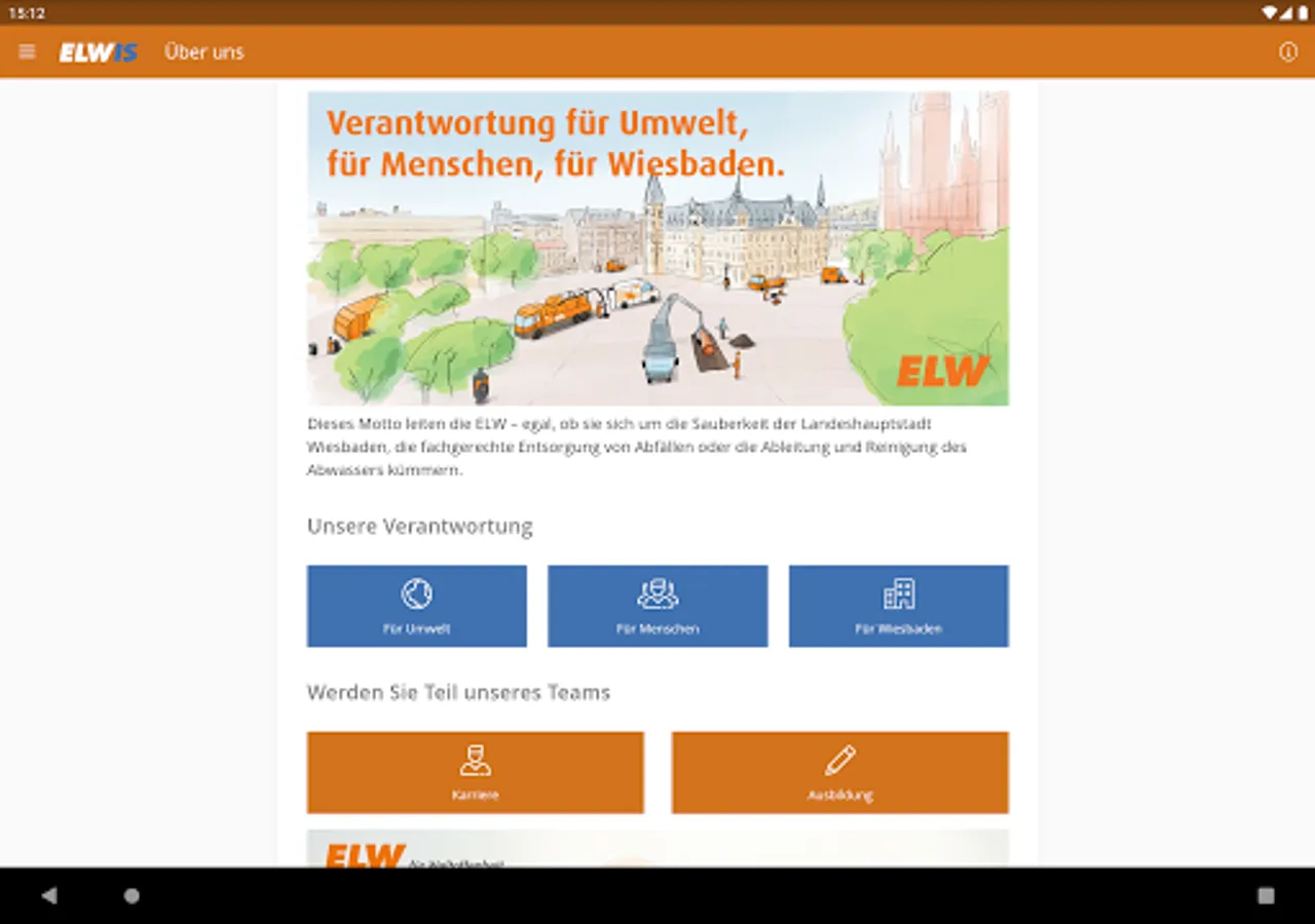 ELWIS - the ELW app offers all the important information about the slogan - "Responsibility for the environment, for people, for Wiesbaden". It is aimed at employees, residents and guests of the Hessian state capital Wiesbaden as well as at people who would like to become part of the ELW team. Download the app and find out what the ELW do in the area of environmental protection and how the in-house operation contributes to the achievement of the state capital's climate protection goals. Find contact persons and opening times, interesting job offers and training positions as well as information on public tours of the landfill, the sewage treatment plant or the Salzbach Canal.