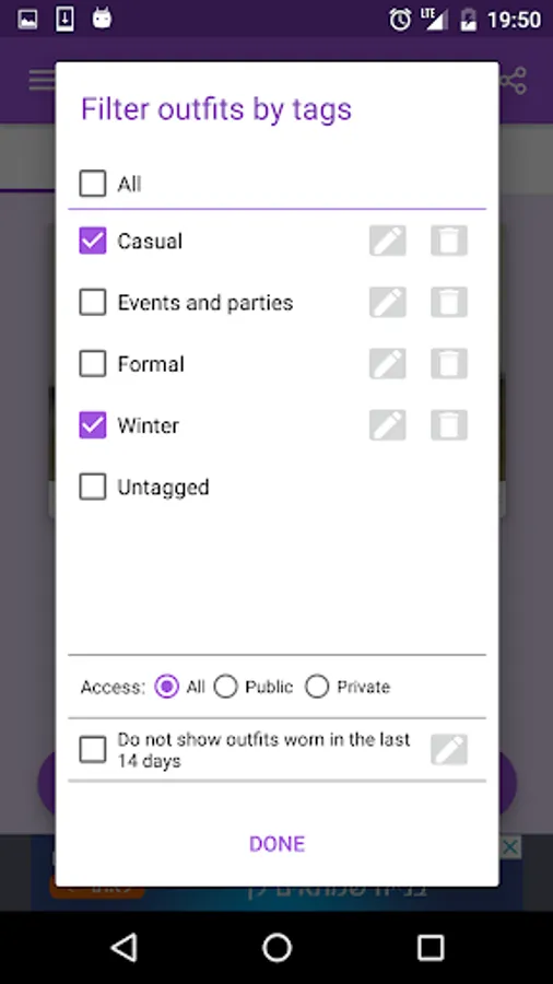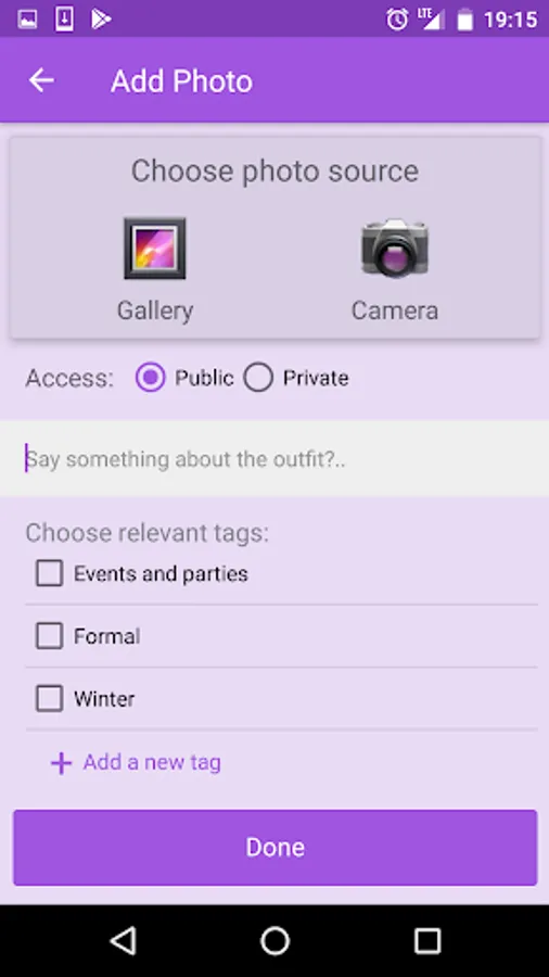 My Outfits allows you to quickly browse through your outfits by tagging your photos for specific events such as "work", "winter", "parties" etc.
