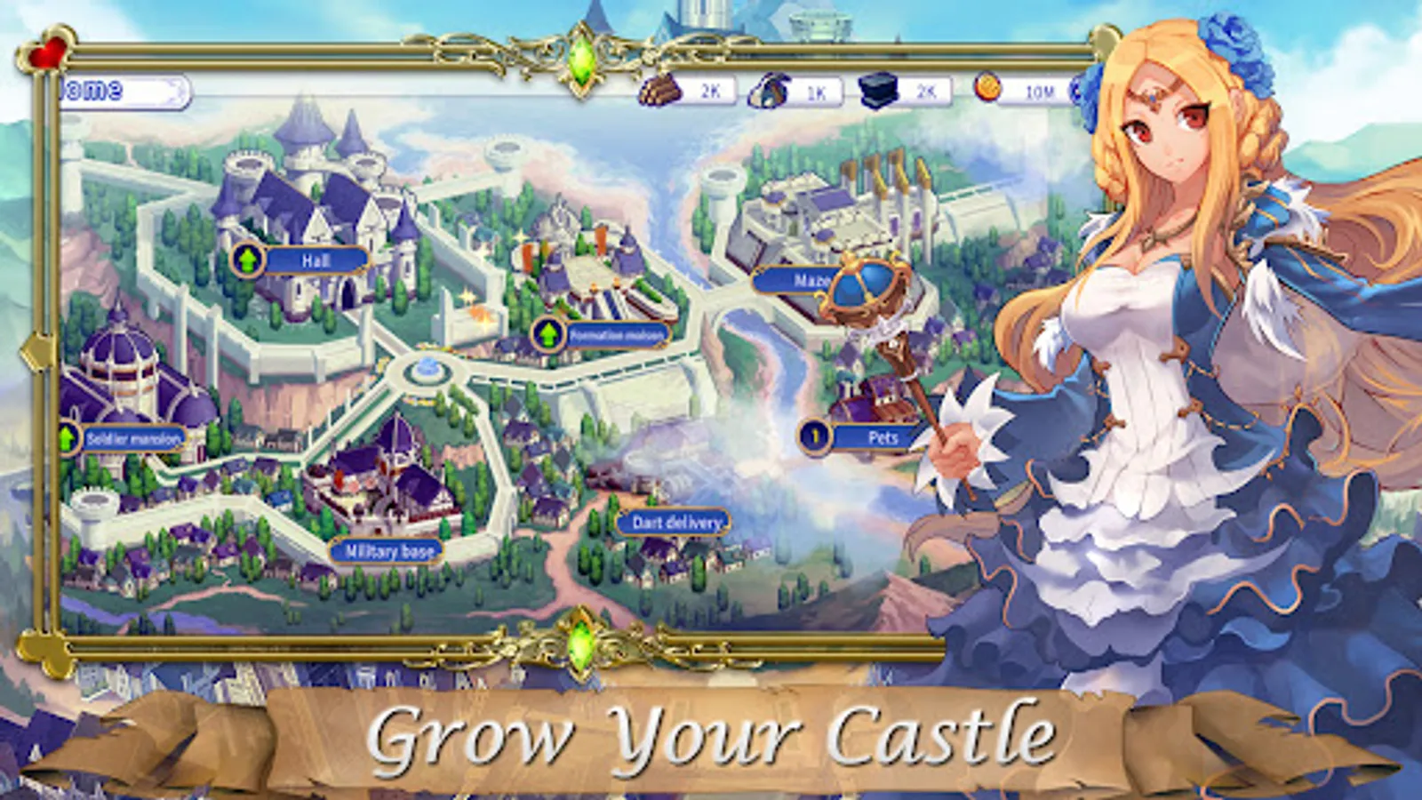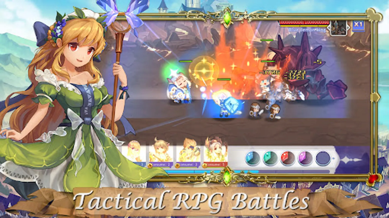 Recruit dozens of chibi girl knight heroes in this anime fantasy RPG, each with their own skills, class, and troops. Obtain heroes through Login Gifts, Elite Levels, Friend Gacha, and Elite Gacha summons, all beautifully drawn in high-quality anime RPG style.
