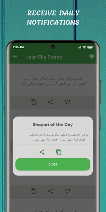 🌟 Daily Dose of Inspiration: Experience a daily dose of poetic inspiration as the app presents you with a new and captivating Jaun Elia couplet every day. Let his words uplift your spirit and provoke thought.