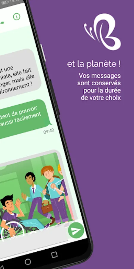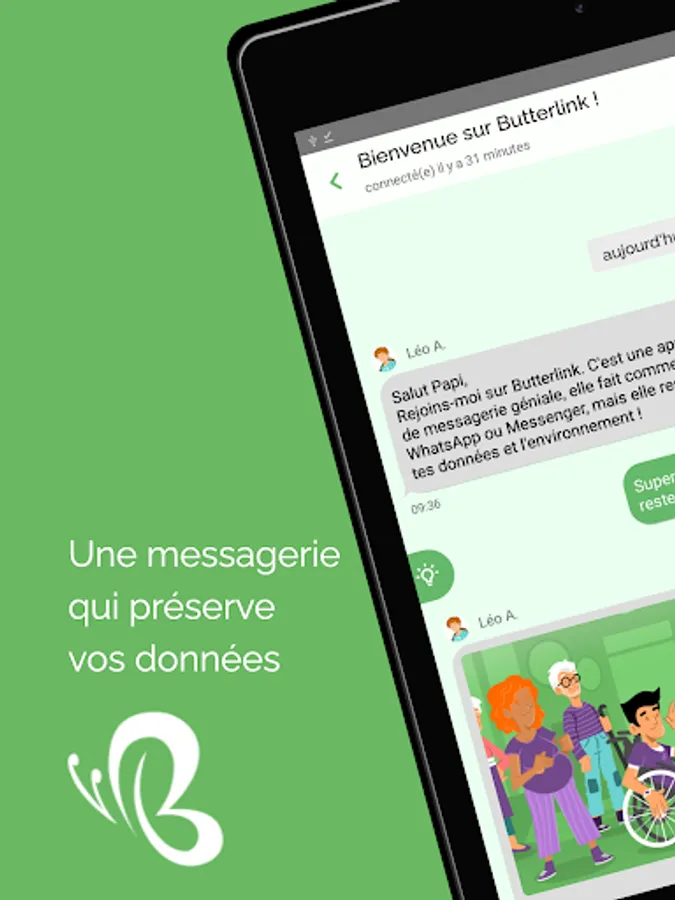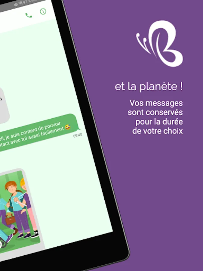 AN ECO-DESIGNED MESSAGING On Butterlink, all content (messages, photos, etc.) is regularly deleted (every 1 to 30 days at most, depending on your choice). Unimportant messages automatically disappear. You keep, in the blink of an eye, only what is important to you and let go of what could pollute the planet unnecessarily!