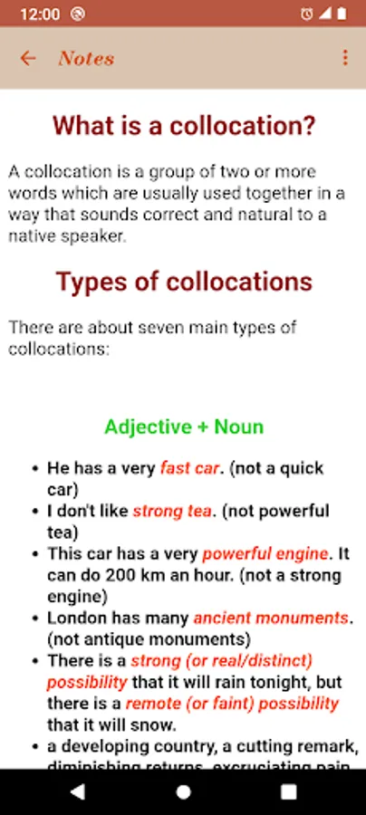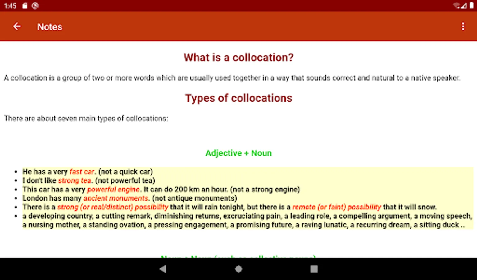 The NOTES activity offers an overview of collocations.It defines the term collocation, lists the seven most common types of collocations, and gives examples of them.