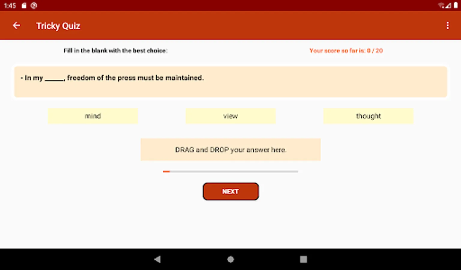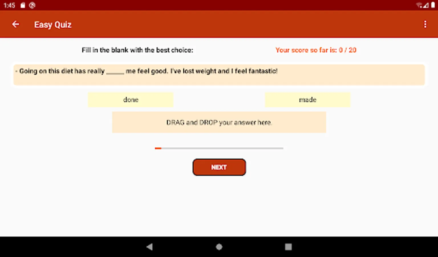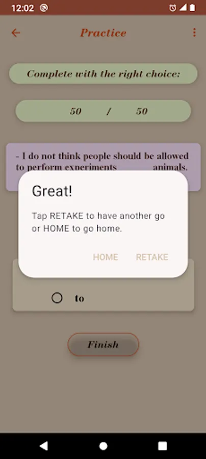 Pick the right answer by clicking one of the three radio buttons. Click NEXT to go forward. At item 50, click FINISH. This shows your score, and 2 buttons. Click RETAKE to retake the quiz with the same set of questions in a new order, or Home to go to Main.