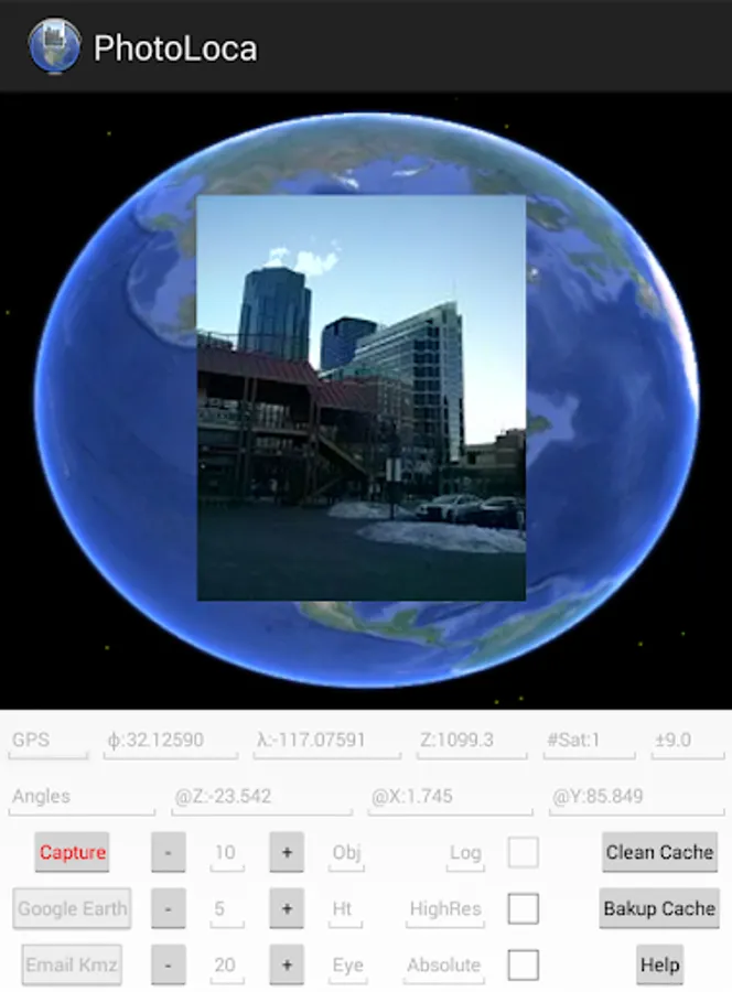Obj: Click + or - to change object distance (distance from the photo to the camera on Google Earth)