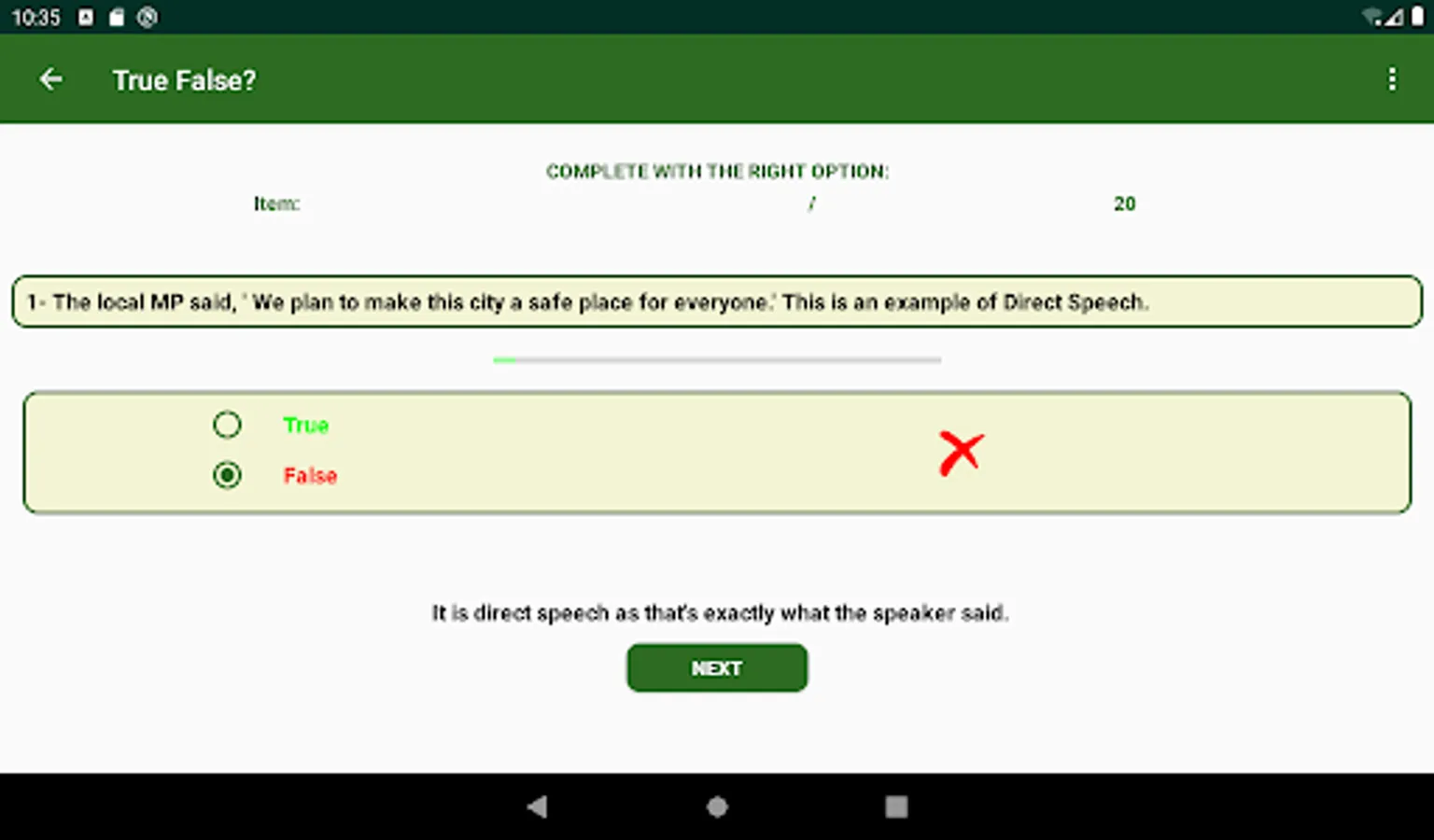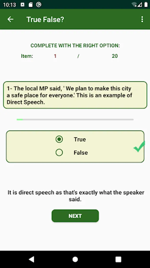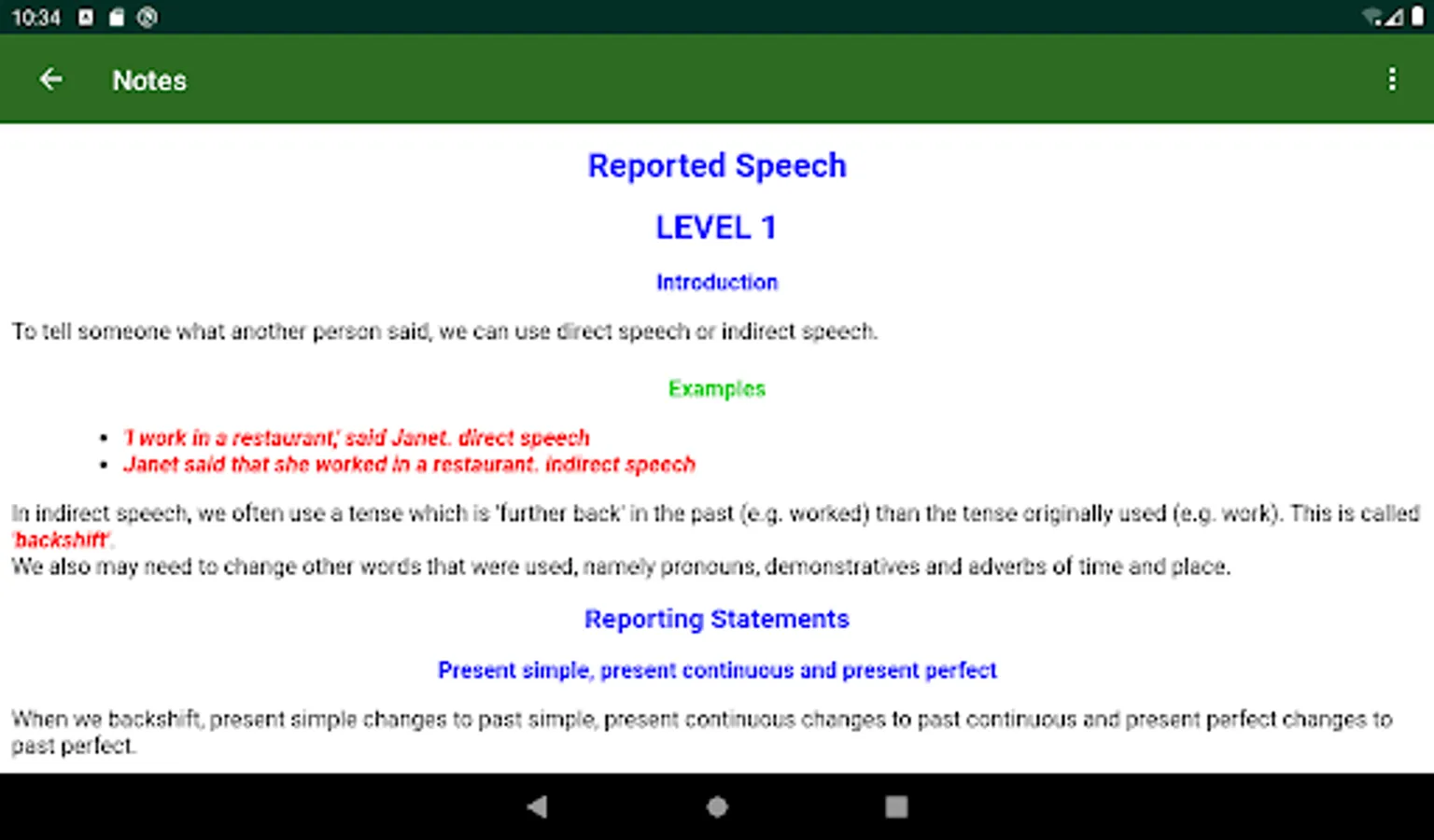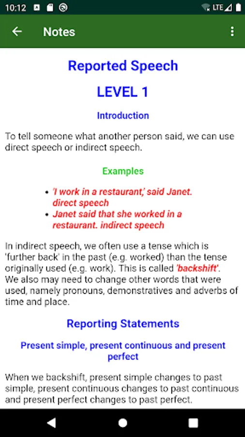 The Notes activity offers detailed notes about and examples of Reported Speech, and a True-or-False activity to test your understanding of the notes detailed in the notes activity.