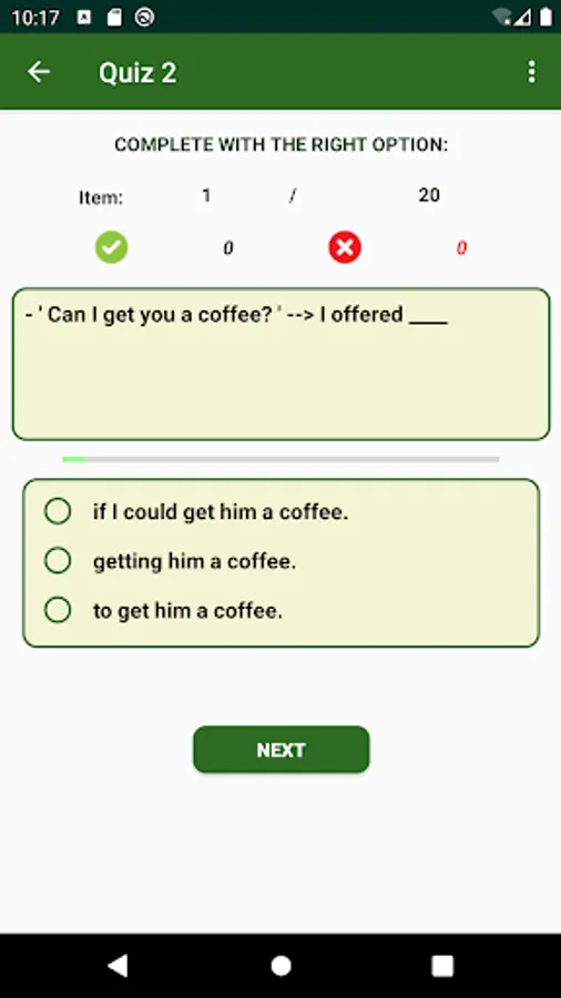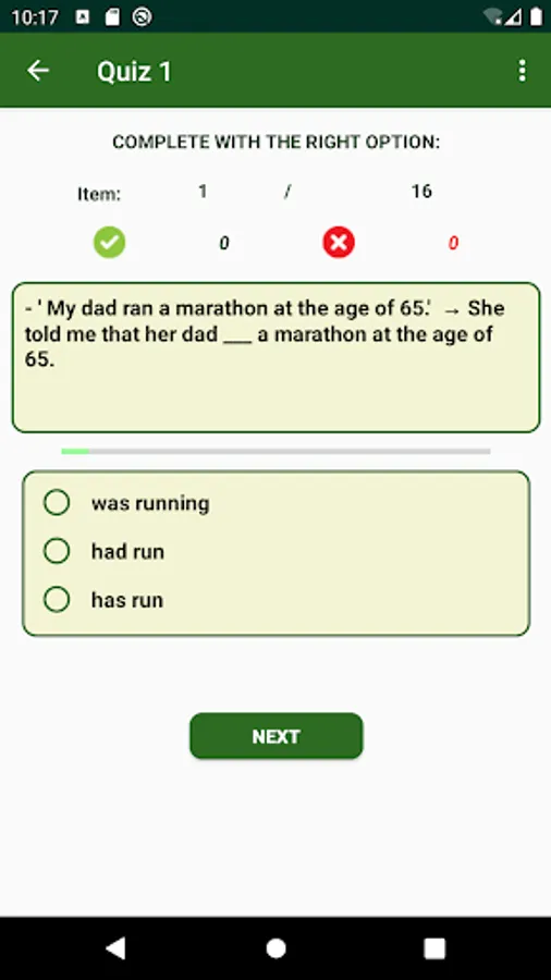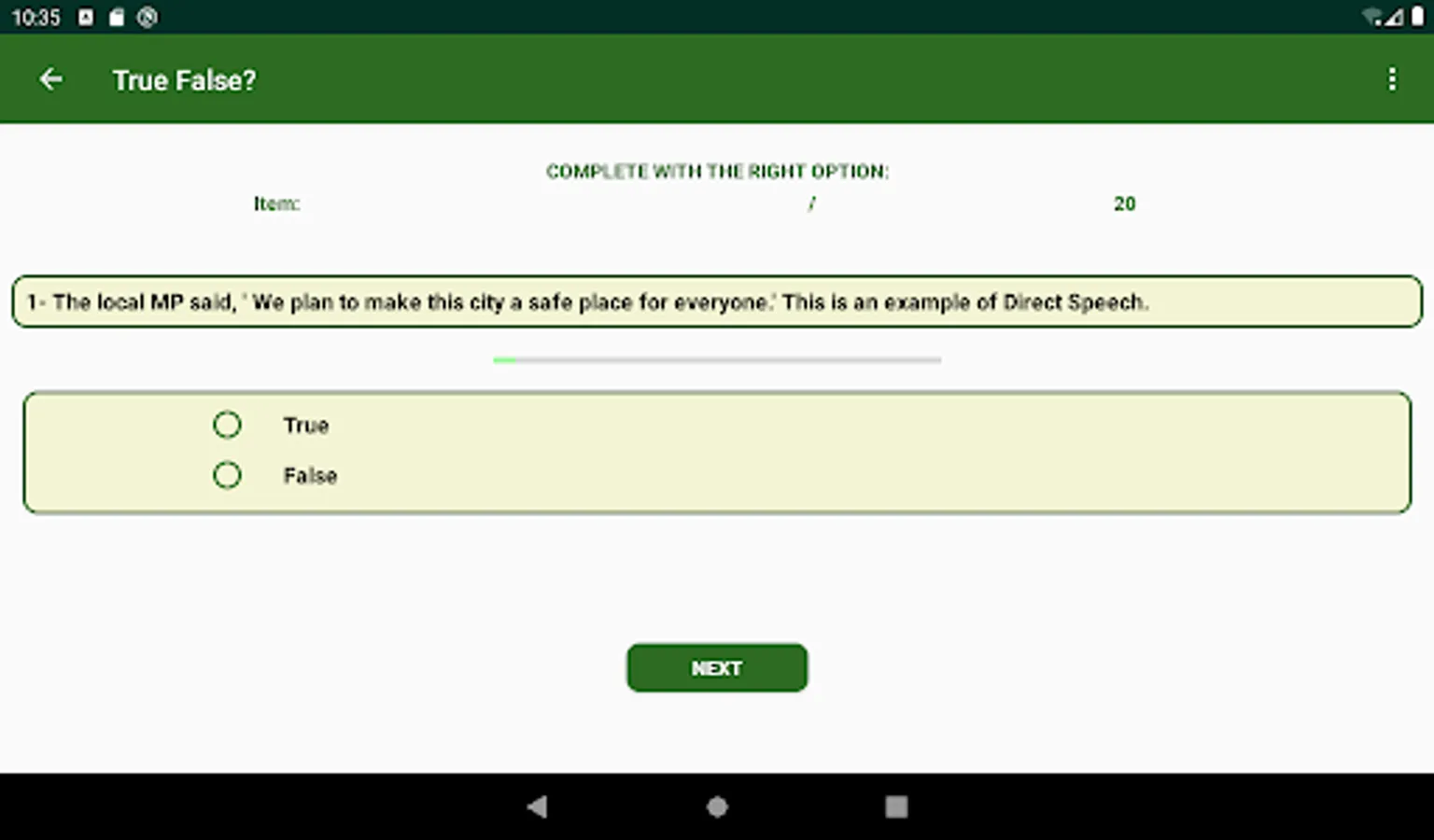 When taking a quiz activity, Pick the right answer by touching one of the offered radio buttons. Your choice is checked immediately and you are told if it is correct or not. Click NEXT to go forward. At the last item, click FINISH. This shows a dialogue with 2 buttons. Click RETAKE to practice the very same items, or HOME to go to Main.