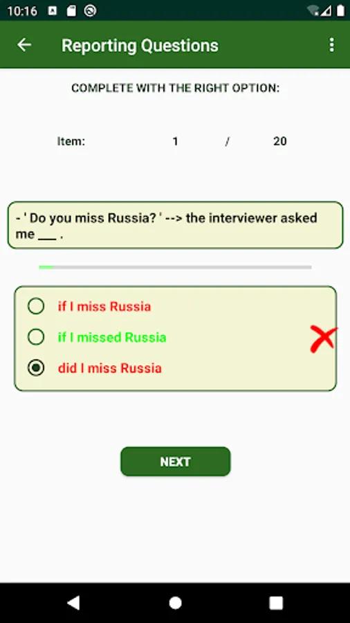 When taking a practice activity, Pick the right answer by touching one of the offered radio buttons. Your choice is checked immediately and you are told if it is correct or not. Click NEXT to go forward. At the last item, click FINISH. This shows a dialogue with 2 buttons. Click RETAKE to practice the very same items, or HOME to go to Main.