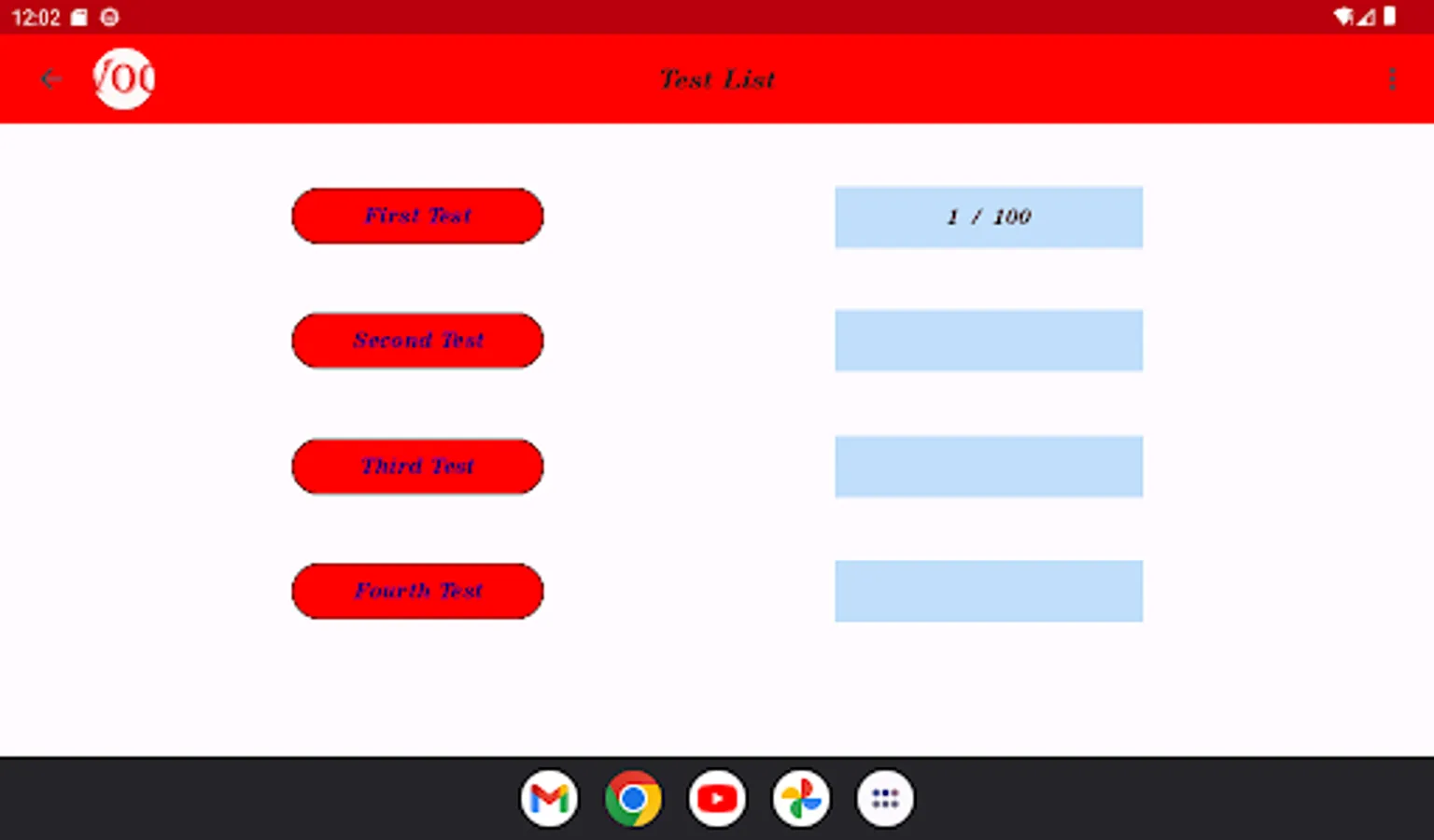 You don't need to take the test in one sitting. You can start a test, leave it, and come back to it later. The app saves your progress. When you finish a test, your score is saved and shown under the test button. If you retake a test, the app saves your most recent score. Comparing scores is a good way to track your progress.