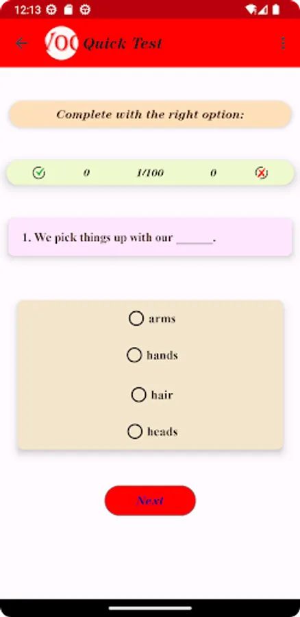 When you start the test, you get a set of multiple choice questions. You need choose the correct option to fill in the blank. Pick the right answer by clicking one of the four radio buttons.