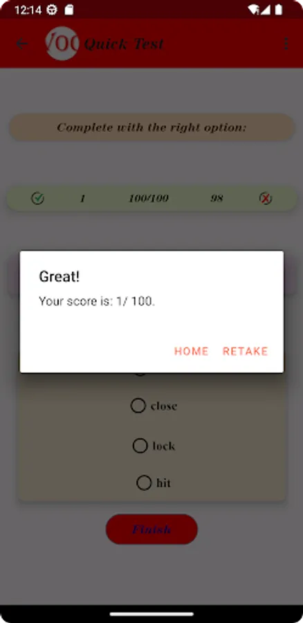 Click NEXT to go forward. At the last item, click FINISH. This shows your score, and 2 buttons. Click RETAKE to retake the test again, or Home to go Home.