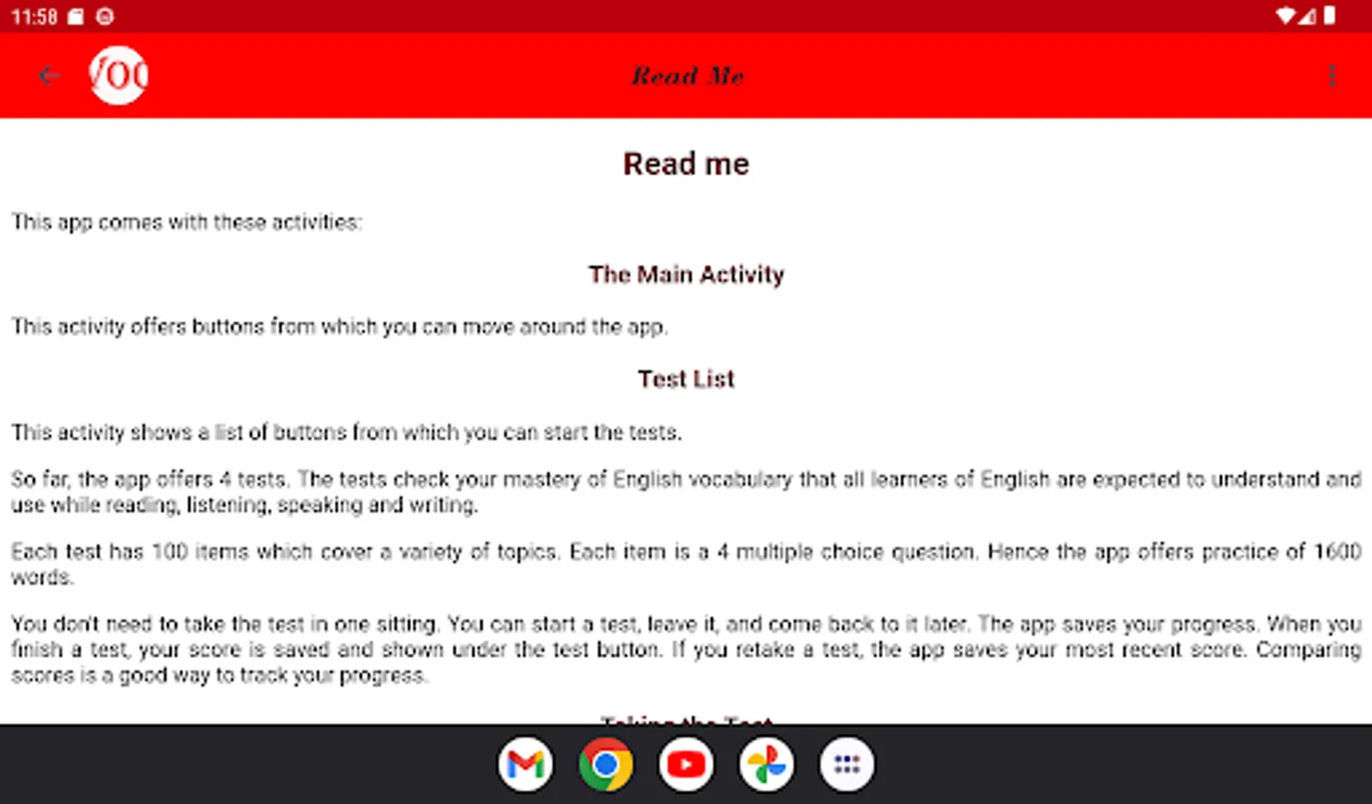 Each test has 100 items which cover a variety of topics. Each item is a 4 multiple choice question. Hence the app offers practice of 1600 words.