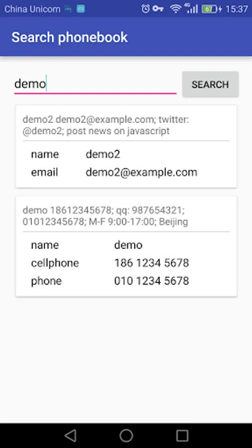 Phonebook allows you to upload your plain text contact file from your computer, and search contact on your phone. It's designed for people who likes to keep all their contacts in a text file. The contact file format is very flexible and it's documented on http://blog.emacsos.com/phonebook-app.html.