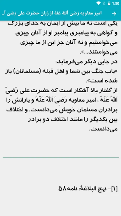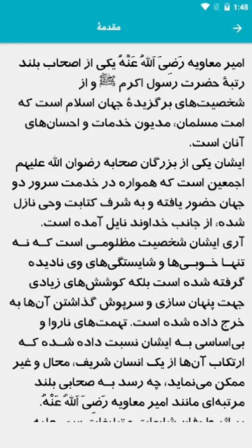 It is a biography of Mu'awiyah ibn Abi Sufyan and his services to the Islamic community. In this work, an attempt has been made to paint a correct and unbiased picture of Amir Mu'awiyah by avoiding disputes and describing historical disputes, and to bring out the facts from the dust of some doubts. At the beginning, he describes Mu'awiyah's family background and lineage and briefly recounts his childhood to youth and his conversion to Islam. In the following, the views of the Companions and their followers on his personality and actions are quoted, and then the various services of this powerful ruler to the Islamic society and the military and social achievements during his reign are described. The final part of the book is dedicated to a brief mention of the moral and religious virtues and virtues of Amir Mu'awiyah.