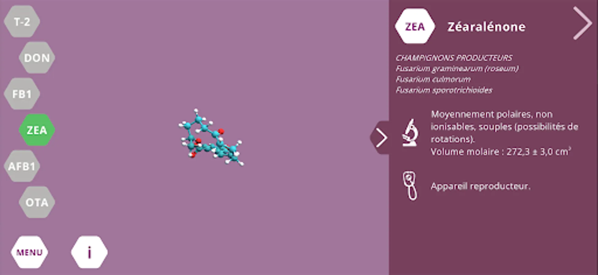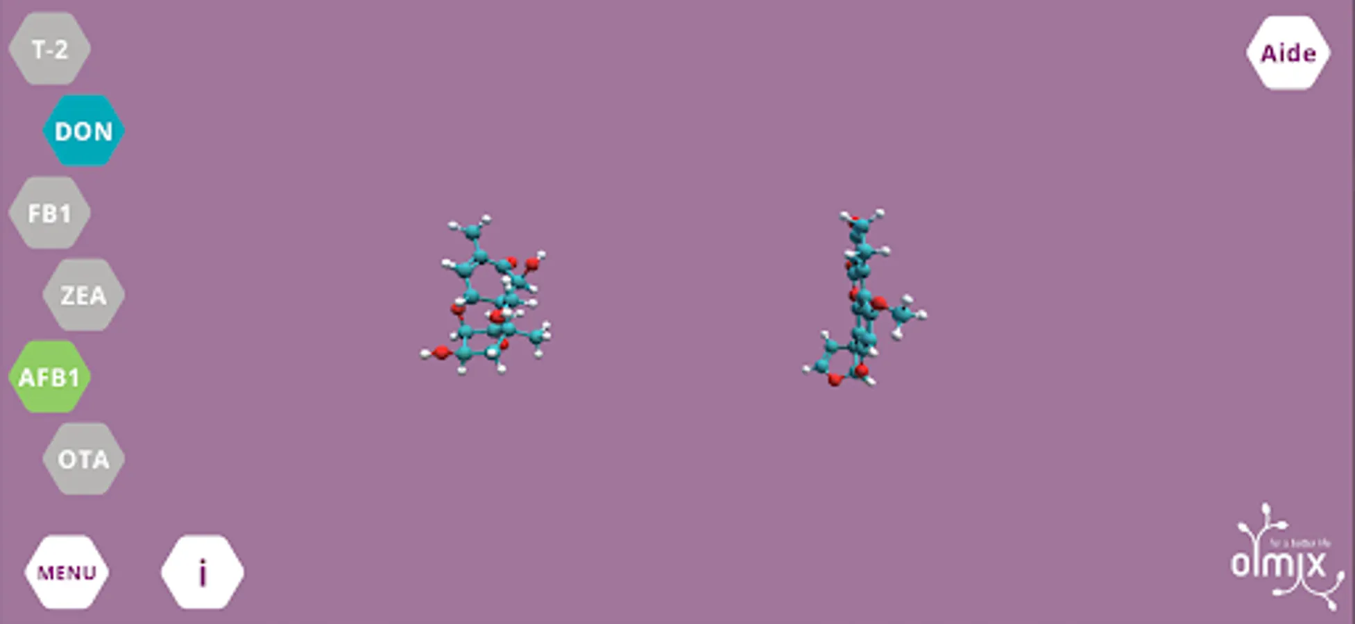 This innovative App is the result of an important scientific review that permits to characterise physico-chemical differences of mycotoxins. Myco’Simulator allows to display the 6 major mycotoxins in 3D, to compare them and to access information about their physico-chemical characteristics and toxicity in animals. Based on scientific reviews, the App also permits to simulate the adsorption of mycotoxins by the major adsorbents.