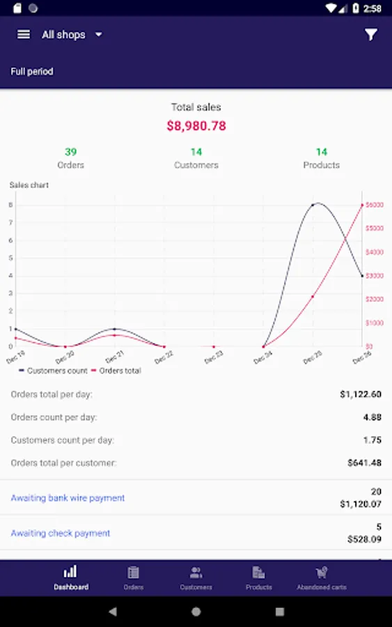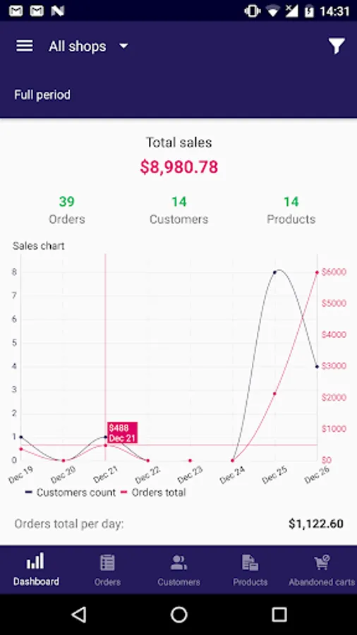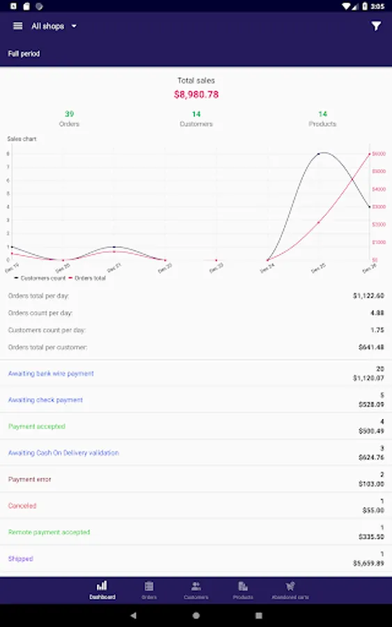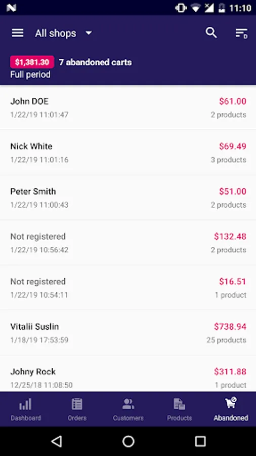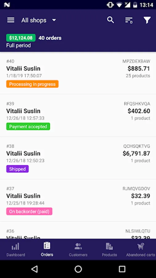 • Ability to get notifications on orders made during a predefined period of time, filter them by status, change it right from mobile phone or tablet