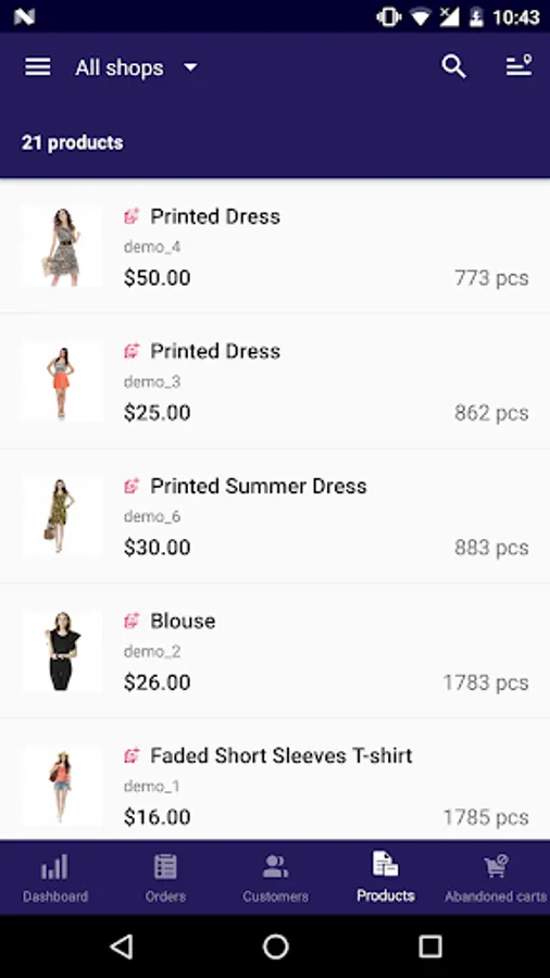With Mobile Assistant for PrestaShop on you can be on the move and have access to the real-time store data reports at your fingertips. Using it you can monitor key details on your products, customers, and orders from your Android device wherever you are.