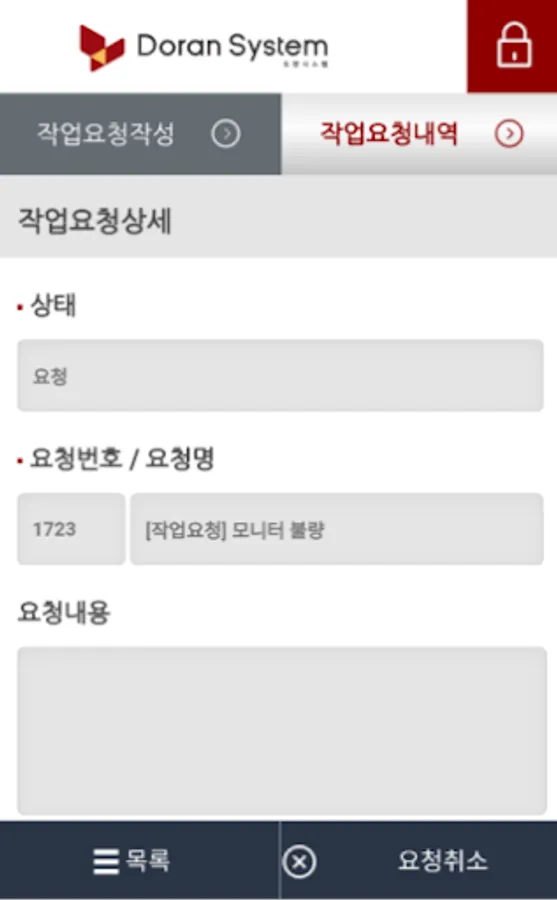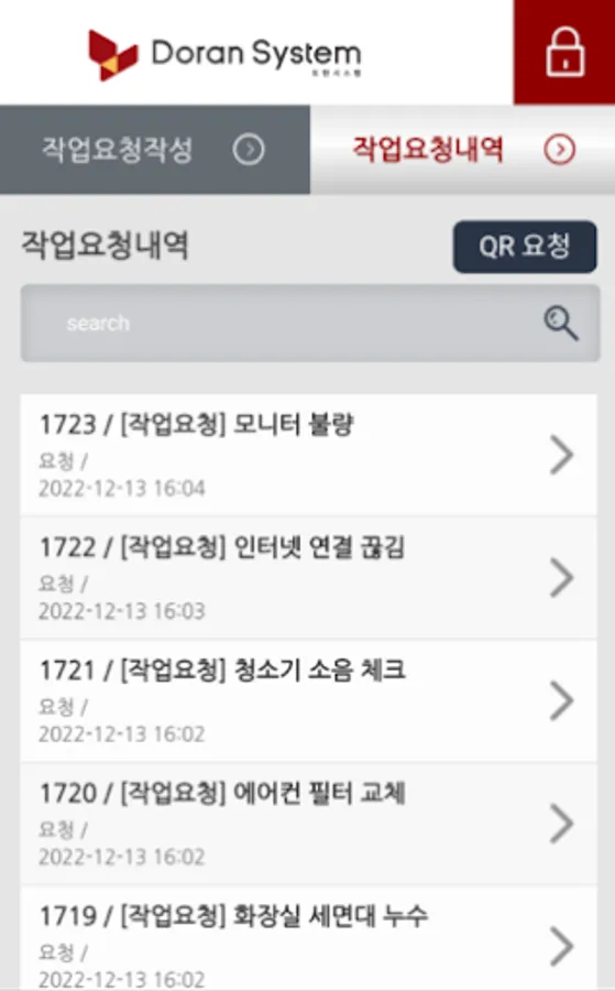 The Doran System Jump request-only app is a requester-only app for civil complaints and work requests of facilities/facility. Upon request, a brief description of the request and a photo can be attached.