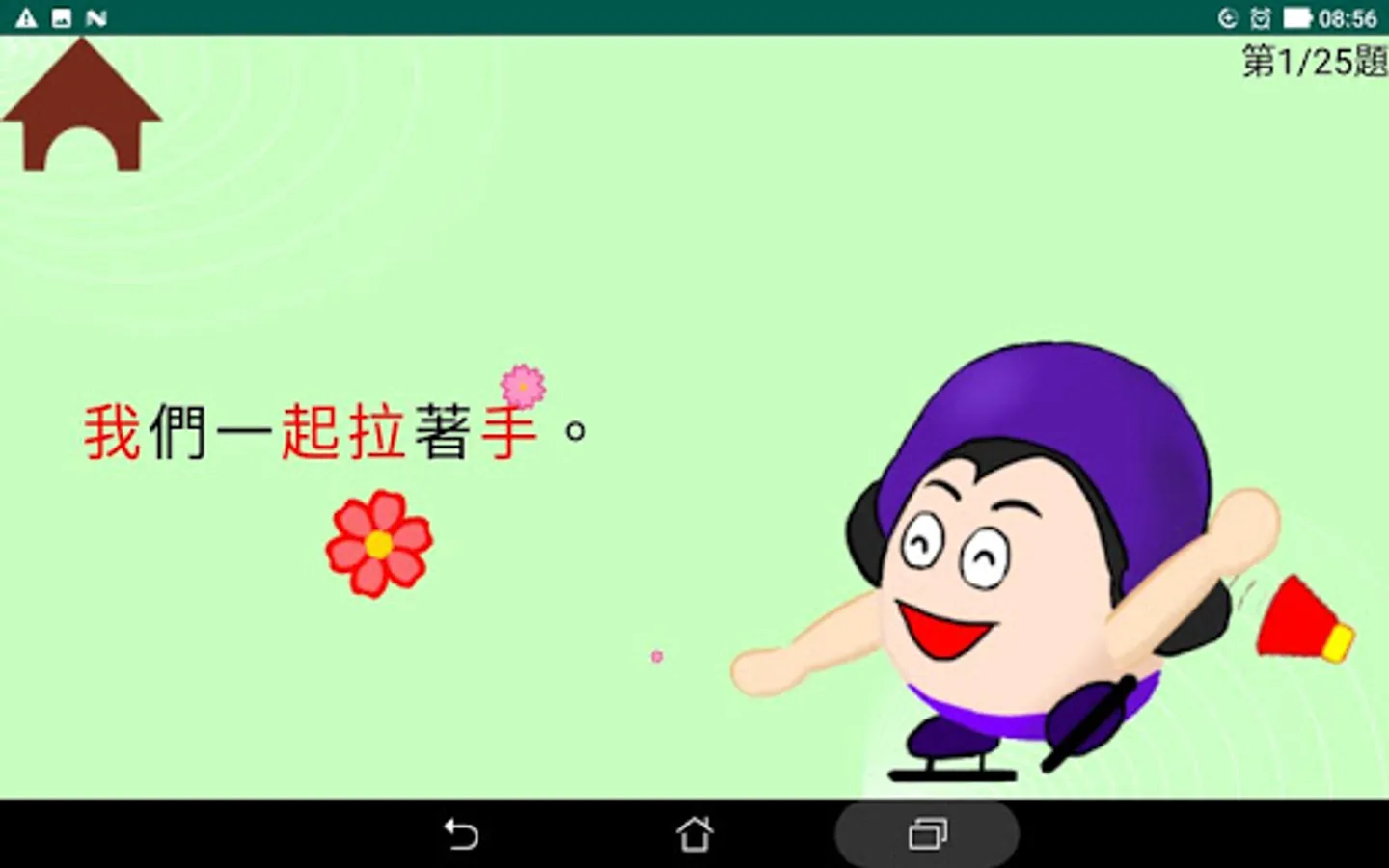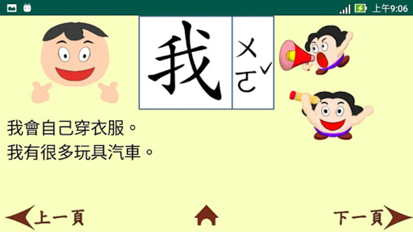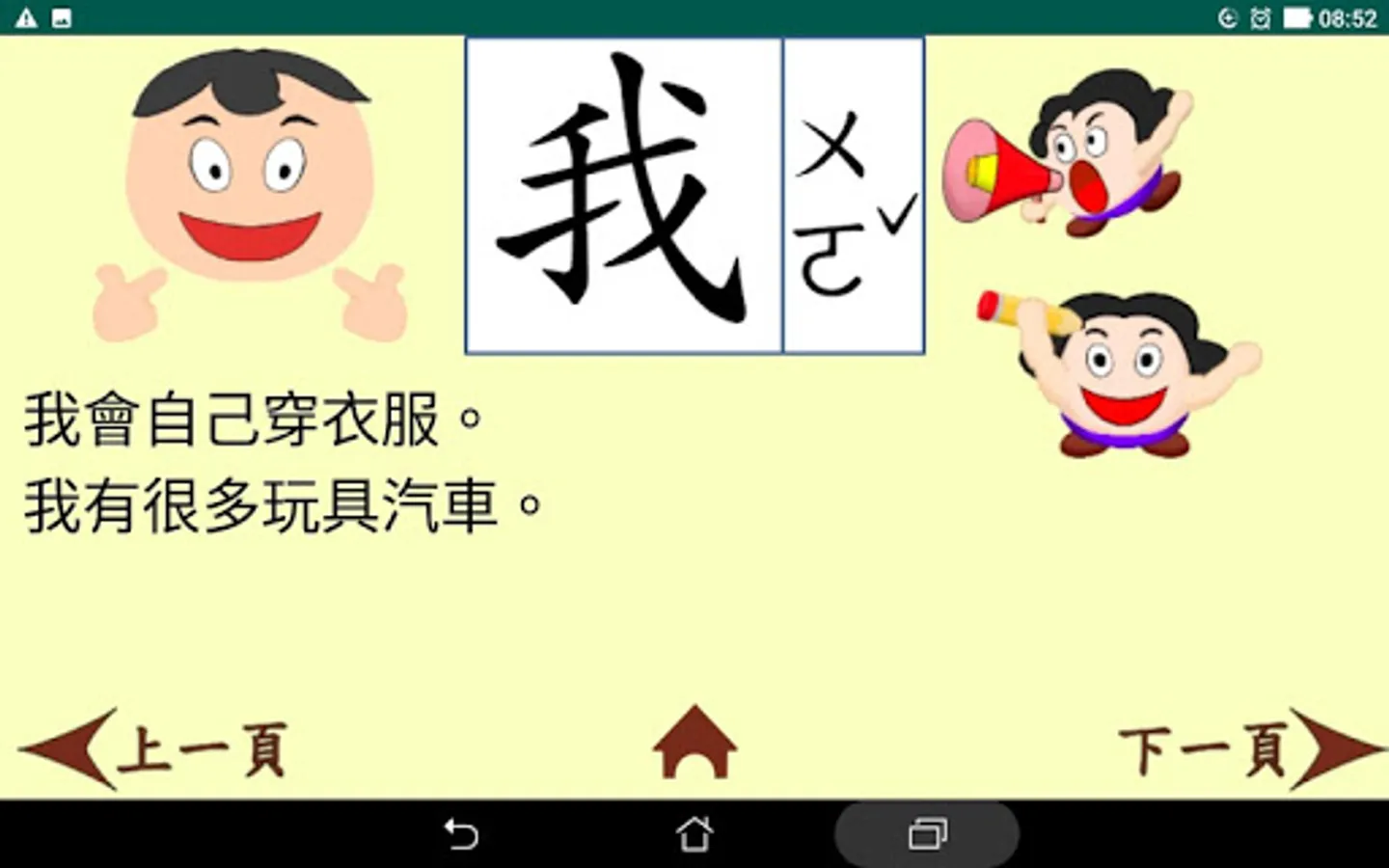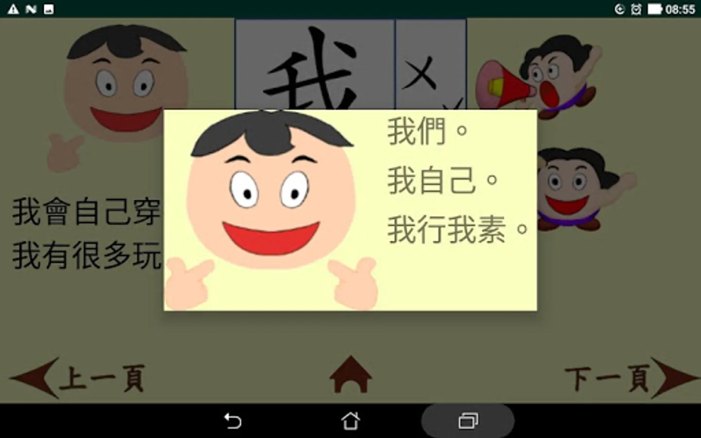 這是一款以小學中低年級程度為學習對象而設計的繁體中文學習app 。它以四首童詩為主軸,每首詩內有全詩與單句朗讀,而且有八個重點學習生字。這些生字經由例句、筆順書寫和選字填空等練習來加強學習者對它們的認真。整個app還包含了三個統整複習活動,讓學習者對所有32 (4x8) 個生字能有更進一步的熟悉與使用。