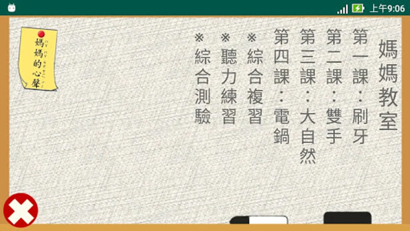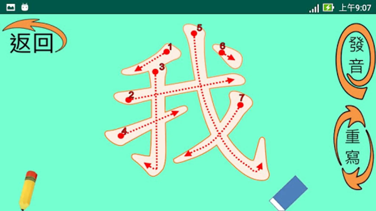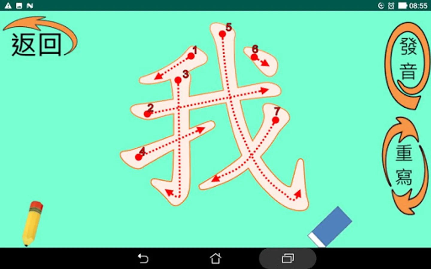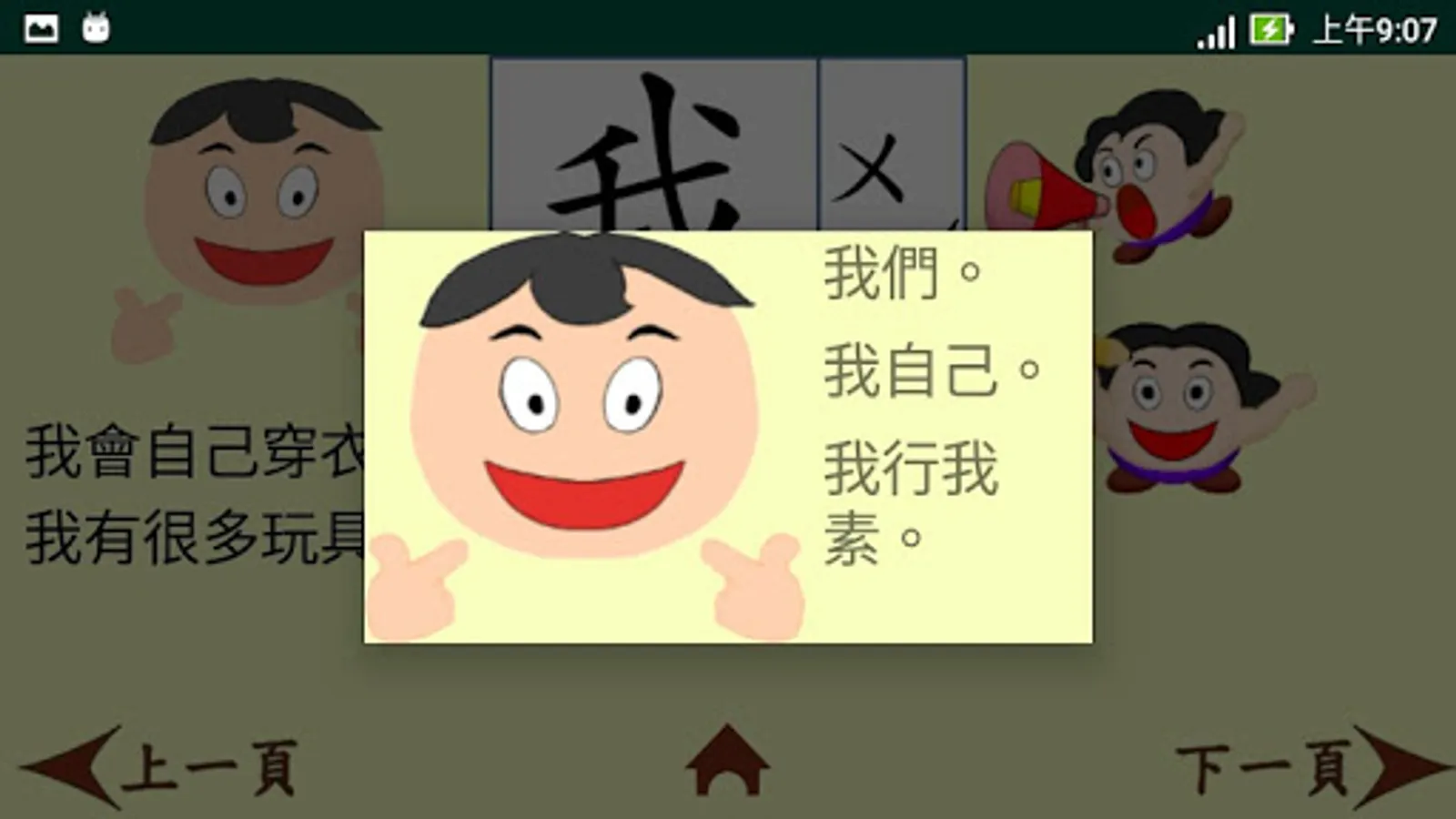 這是一款以小學中低年級程度為學習對象而設計的繁體中文學習app 。它以四首童詩為主軸,每首詩內有全詩與單句朗讀,而且有八個重點學習生字。這些生字經由例句、筆順書寫和選字填空等練習來加強學習者對它們的認真。整個app還包含了三個統整複習活動,讓學習者對所有32 (4x8) 個生字能有更進一步的熟悉與使用。