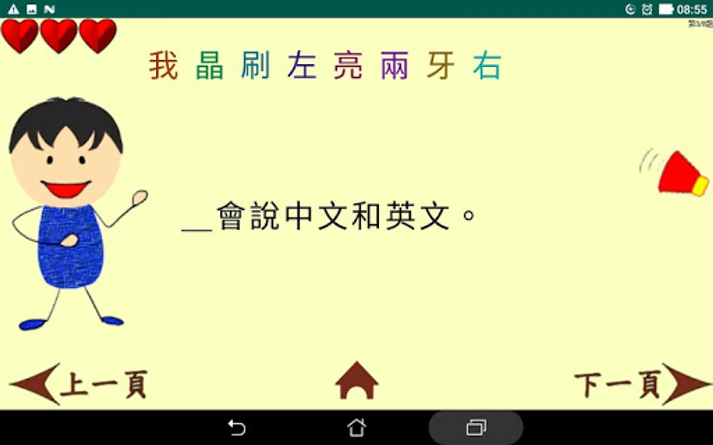 <課文> 每一課的課文中,皆有全文朗誦,使用者也可以按點單句,以自己的步調來學習。『重點字詞』的活動中包含了八個生字;每個生字都有相對應的發音、例詞、例句和筆畫順序的書寫。『自我測驗』的活動是填空練習,使用者需從課文中的八個生字選取適合句子的正確單字並拖曳至句中的空格中。