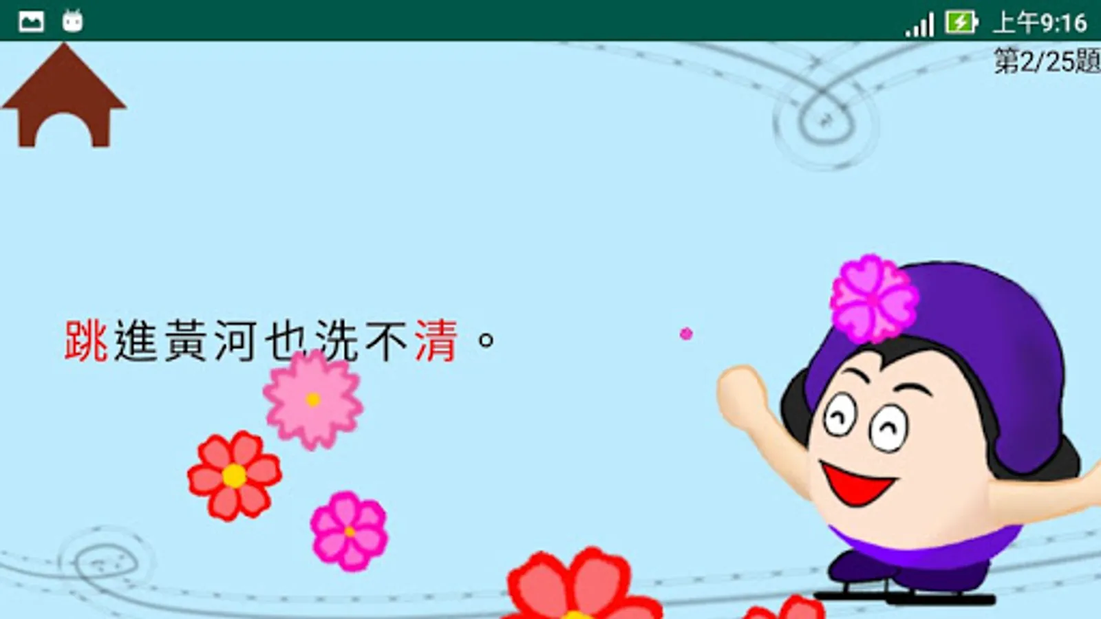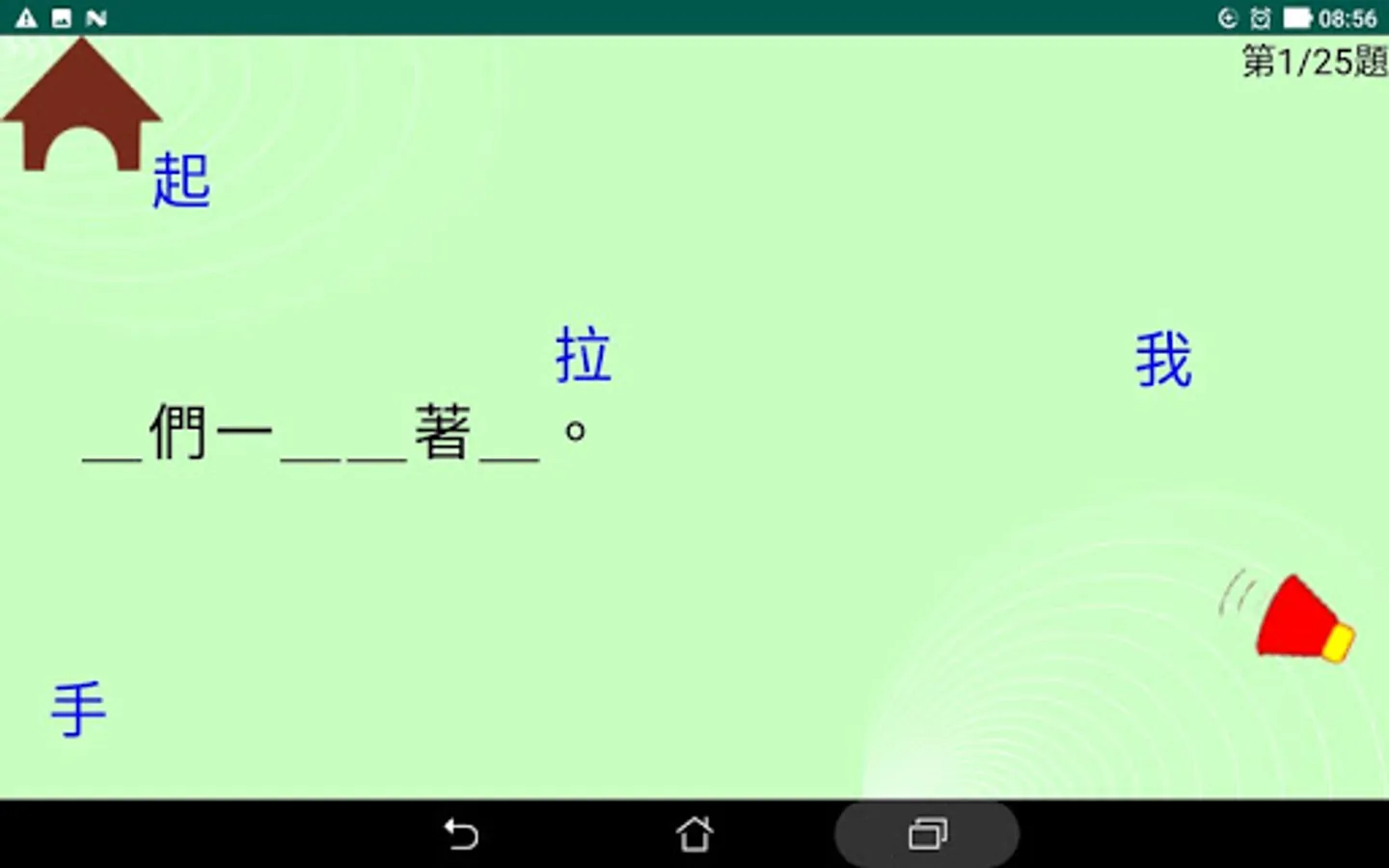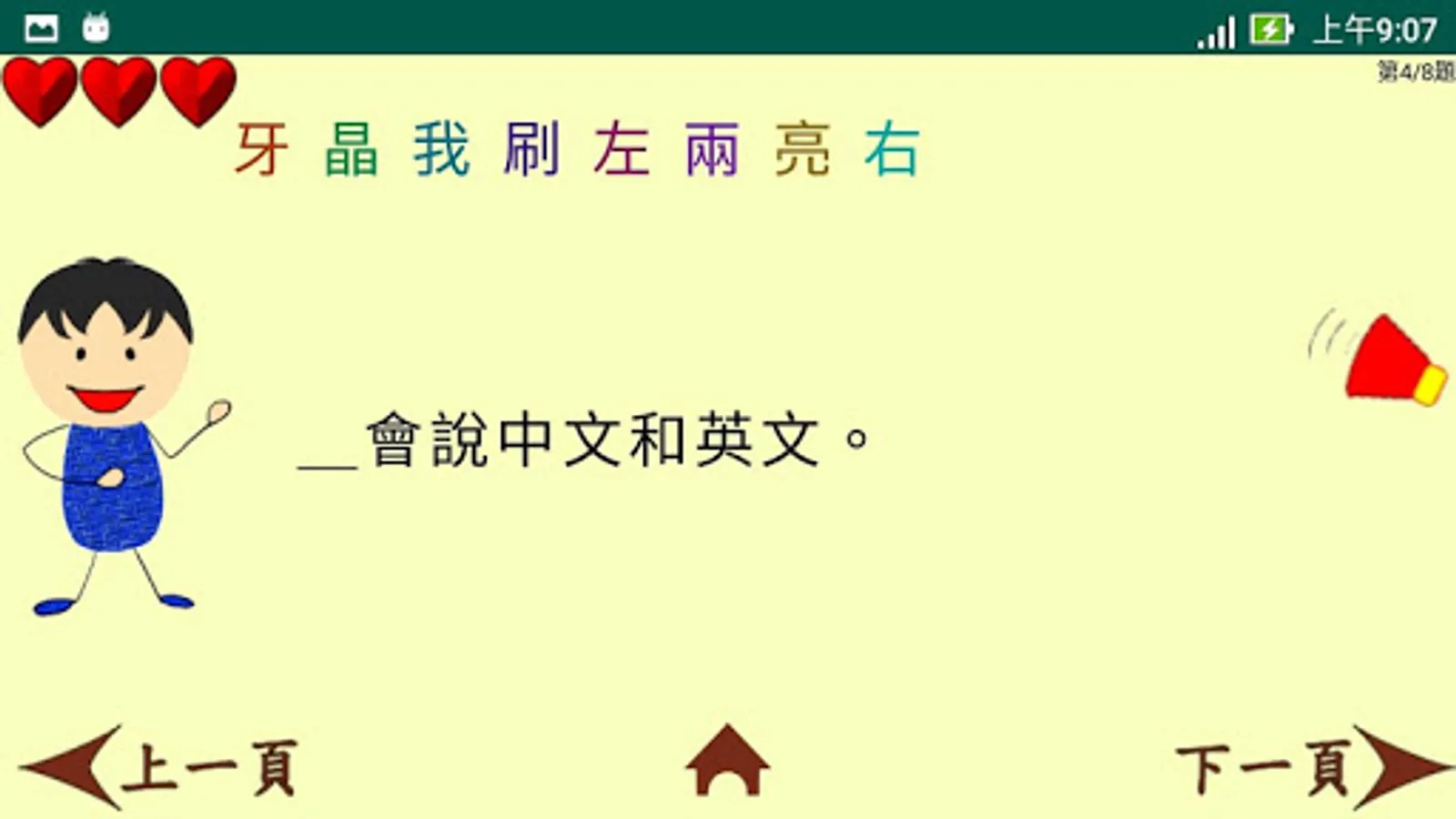 <綜合複習>收集了所有四課裡的32生字以及它們的例詞,使用者可以自我測驗自身的認字能力。