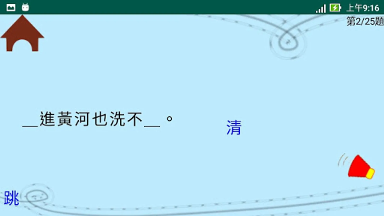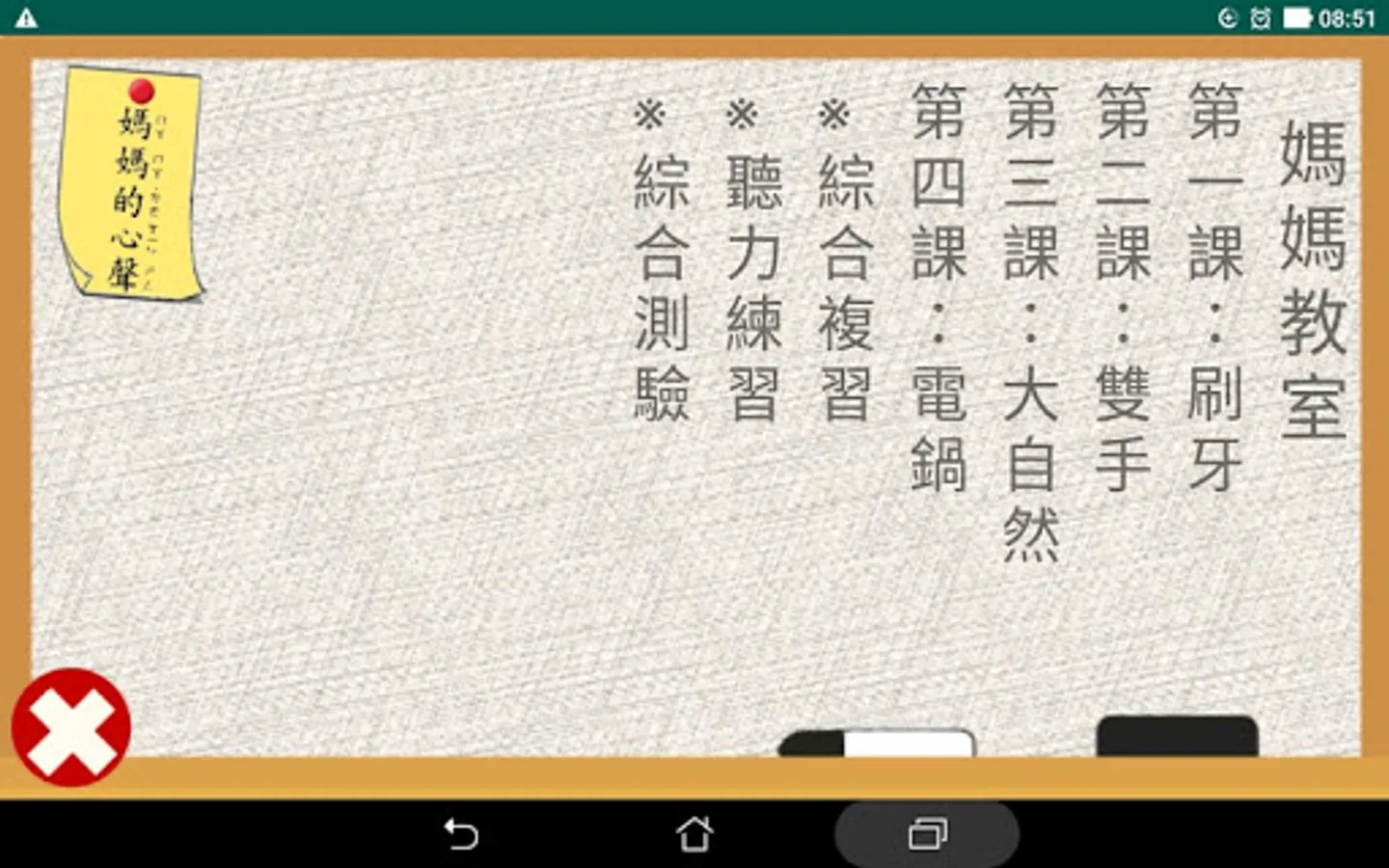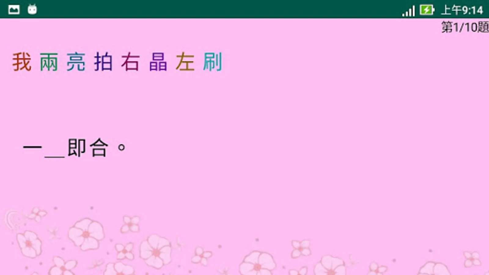 <綜合複習>收集了所有四課裡的32生字以及它們的例詞,使用者可以自我測驗自身的認字能力。