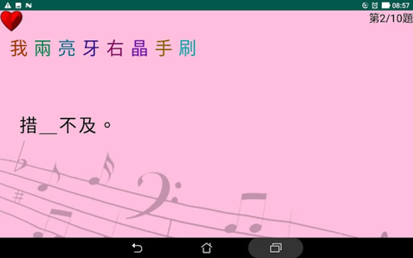 <綜合測驗>與課文中的『自我測驗』相似,但單字選擇與題目出自於所有32個生字的運用。每次測驗時皆從題庫中亂數選取十題 ;當測驗結束時的成績單畫面是一個簡單的遊戲以獎勵使用者完成十題測驗。