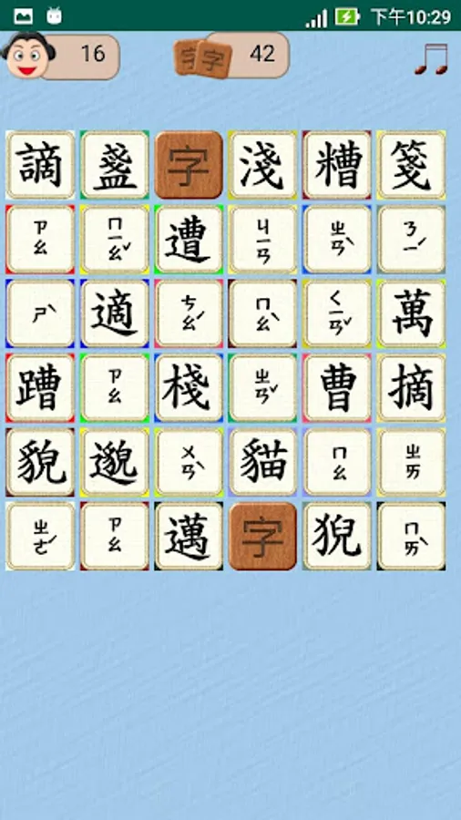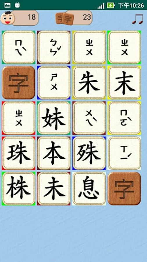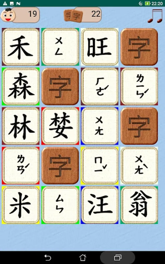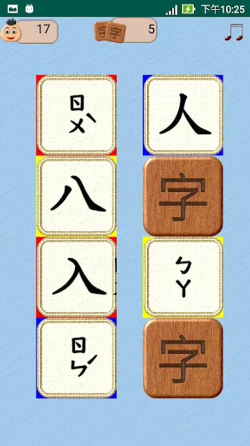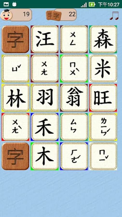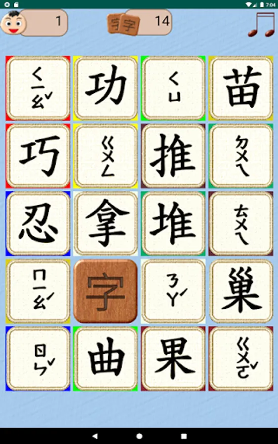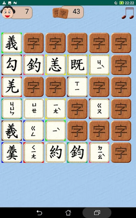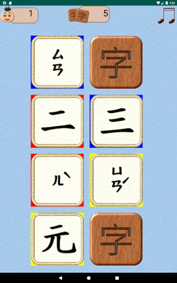 中文字記憶翻牌乃一款中文單字與注音的配對遊戲。很多中文字不僅形近音近,甚至一字多音。這遊戲旨在測試與加強使用者的中文識字能力。分三個等級,每個等級有四十關卡,總共收錄1280個中文字。使用者必需把正確的單字和注意配對在一起。