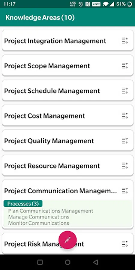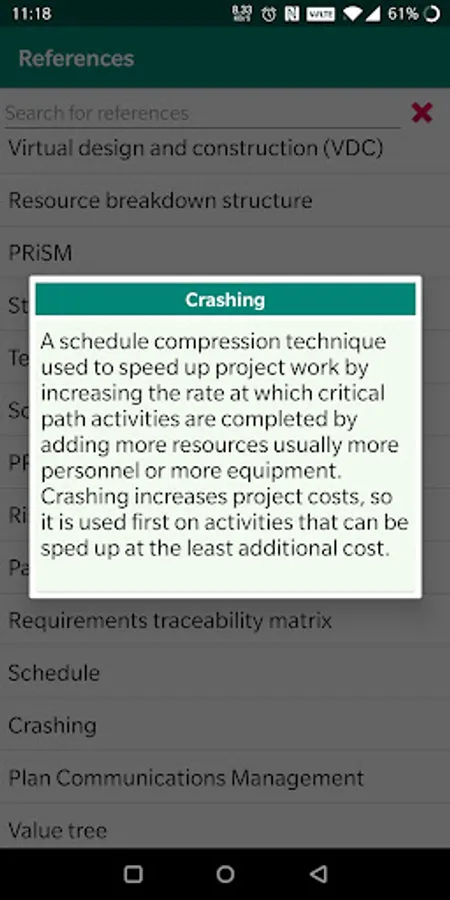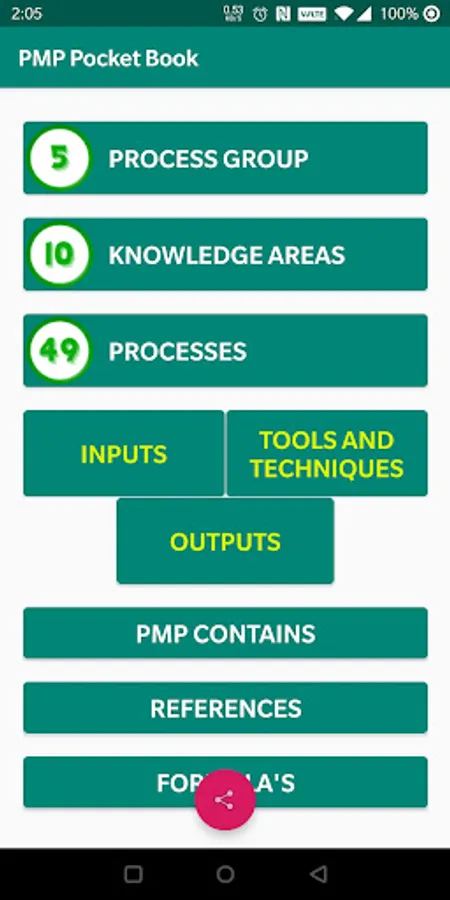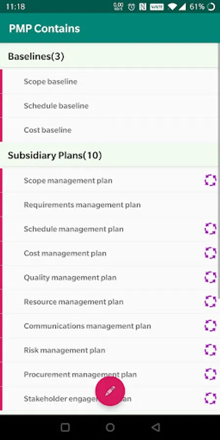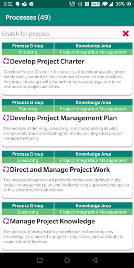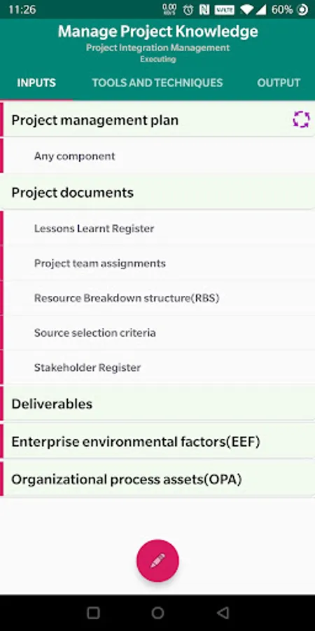 This app contains all the references on topics you learn as part of your PDU/contact hours from PMBOK. The Process groups, knowledge areas, process, input , tools and techniques , output are organized in an useful way which helps you refer/review the topic on a high level anytime any where without going through entire document.