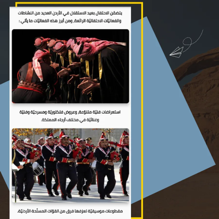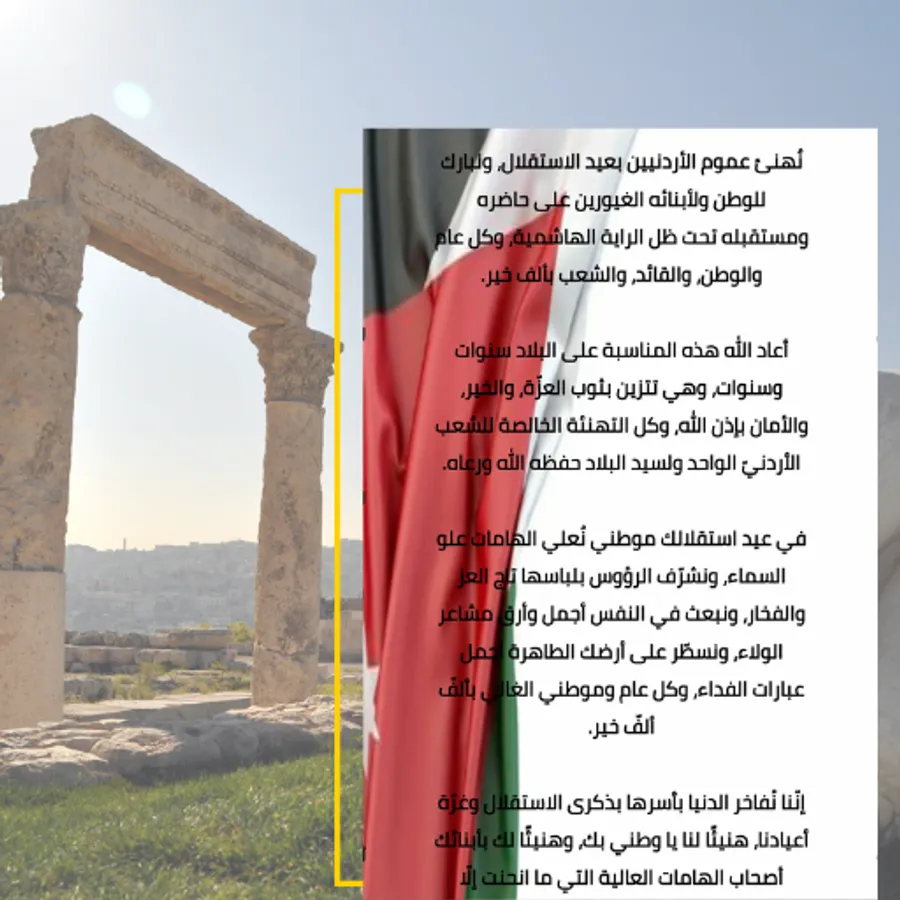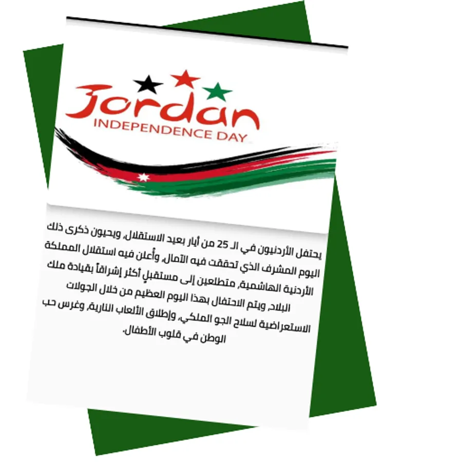 The Jordanian Independence Day is celebrated in the Hashemite Kingdom of Jordan on the twenty-fifth of May every year. In view of Jordan's complete independence from Britain on that day in the year 1946 AD, and the Jordanian Independence Day is considered an official holiday in all institutions of the State of Jordan, as Jordanians remember the battle of previous generations in order to achieve the freedom of the country and the freedom of the people, and the development and advancement of the country as well, and the sky of the capital, Amman, lights up Fireworks to celebrate this anniversary.
