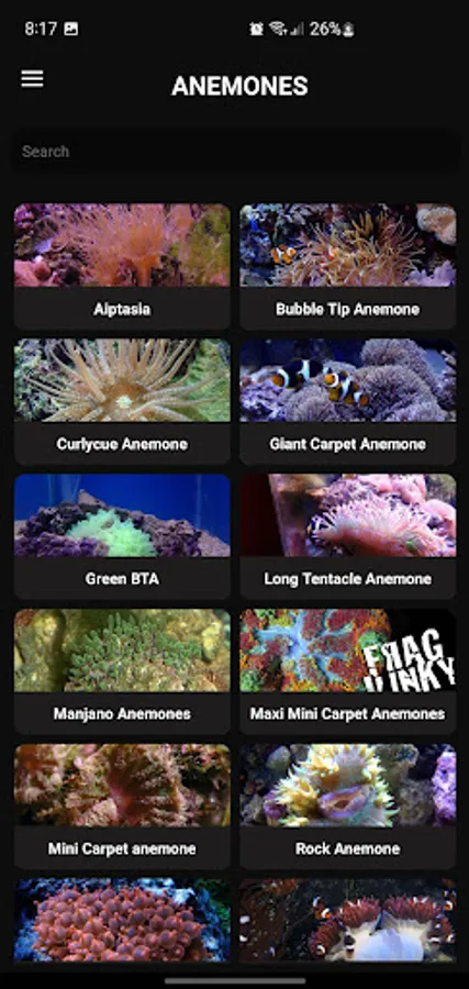 * Review husbandry recommendations for algae and plants, anemones, crustaceans & mollusks, fish, invertebrates, LPS corals, pests, pods & snails, soft corals, SPS corals, worms, cucs, starfish, Zoanthids, and palys