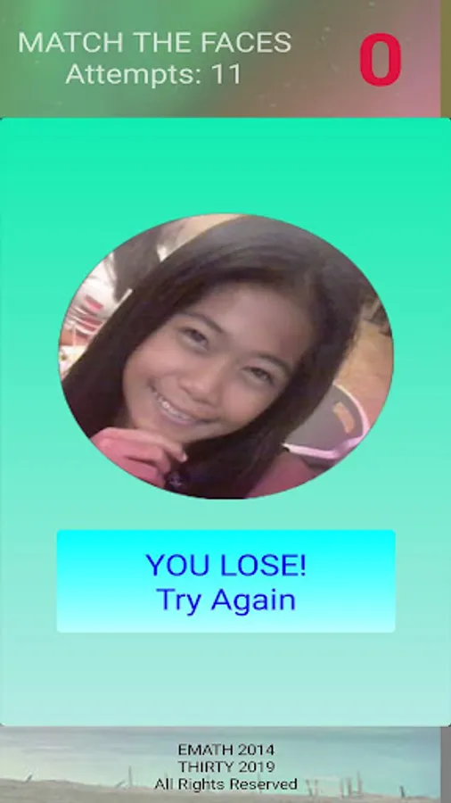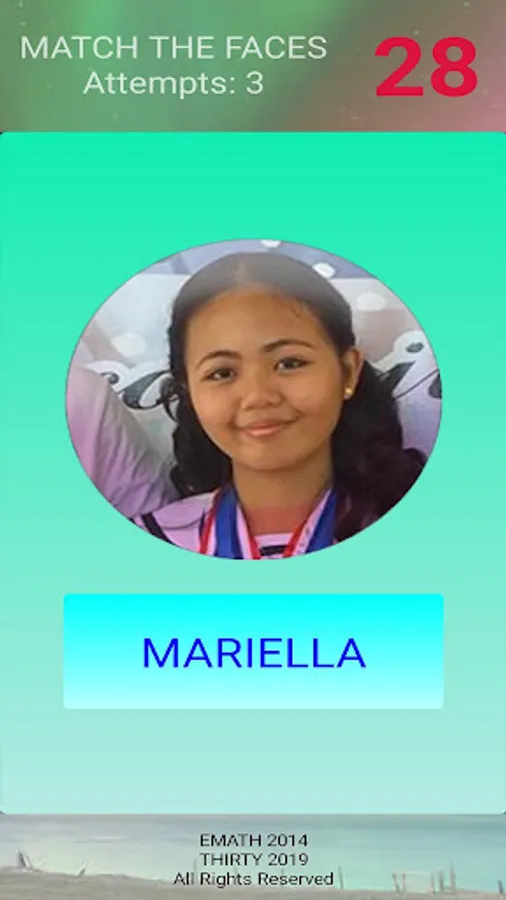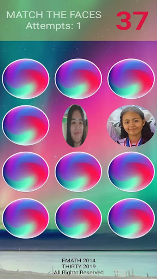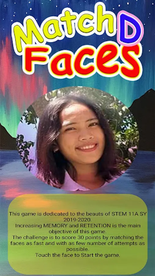 This game is dedicated to the beauts of STEM 11A SY 2019-2020. Increasing MEMORY and RETENTION is the main objective of this game.The challenge is to score 30 points by matching the faces as fast and with as few number of attempts as possible.