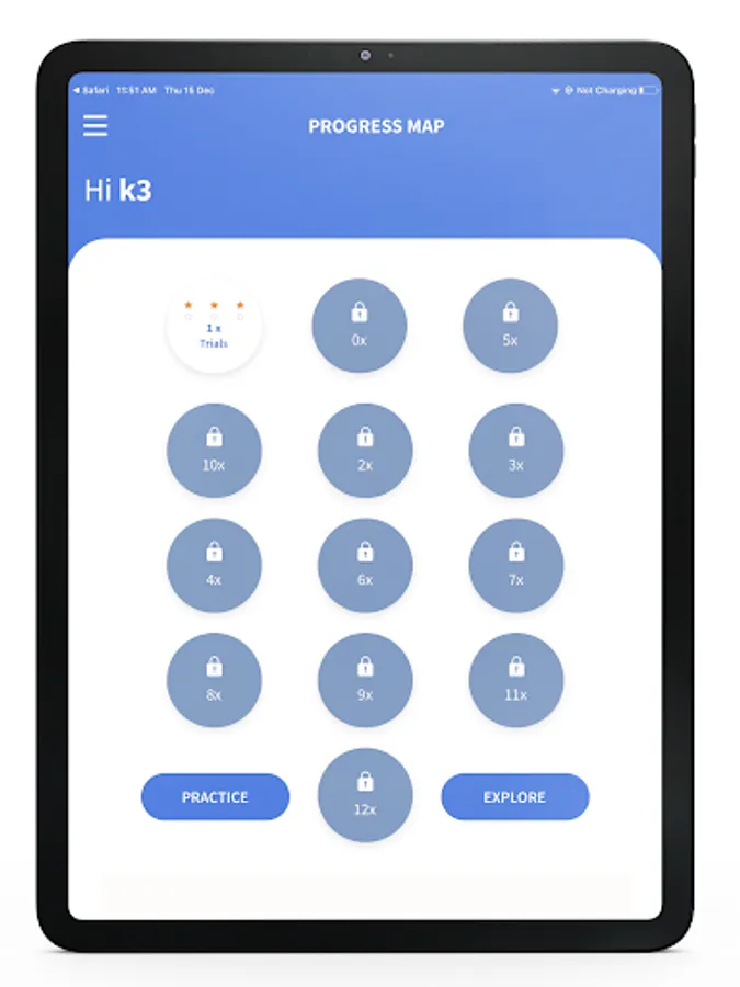 eMathmind features three stages of learning composed of three rounds (or stars). Each round tackles accuracy, speed and retention in subtly different ways by presenting a full set of multiplication problems for a given multiplier (e.g. 1’s, 0’s, 5’s).