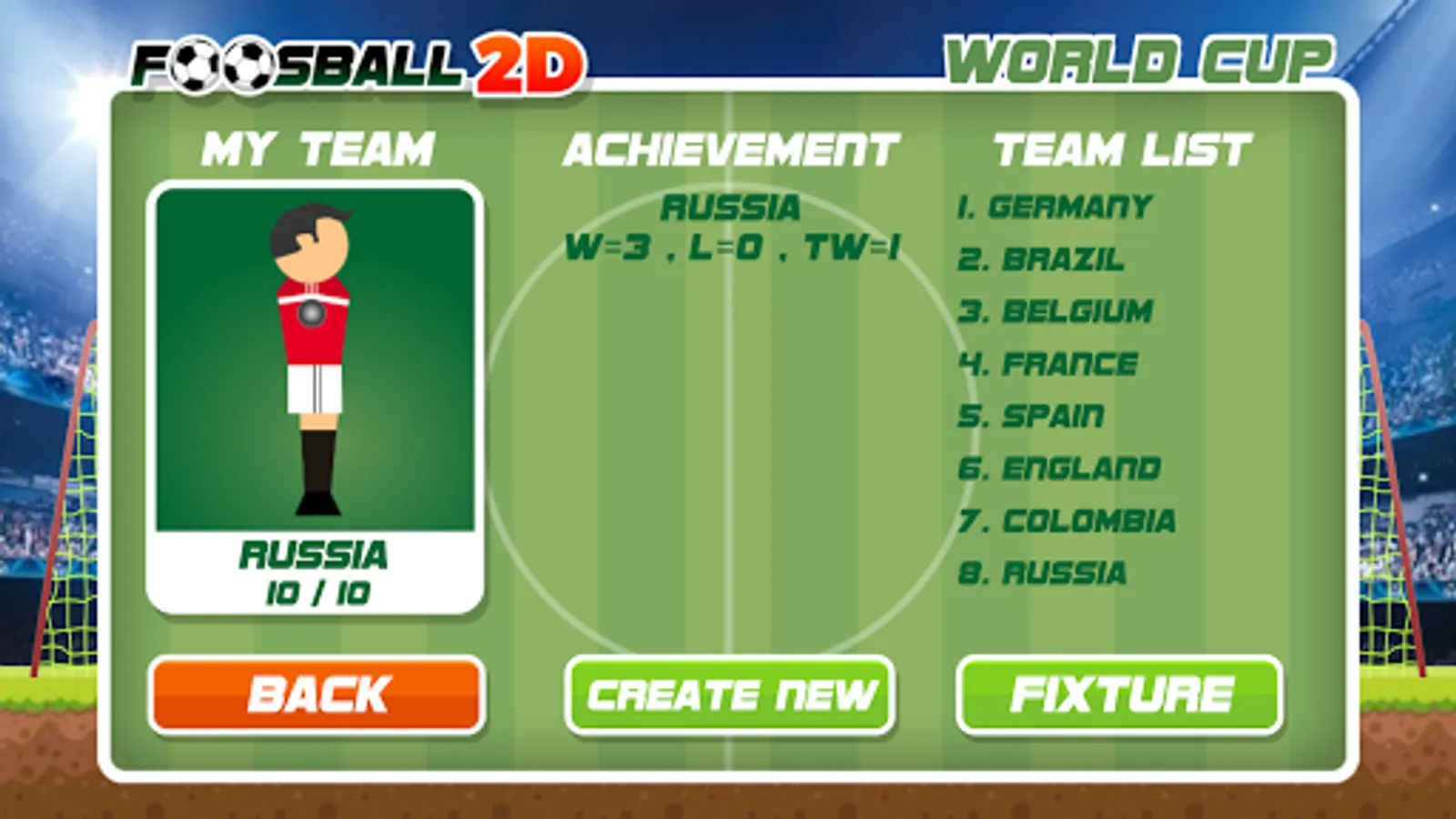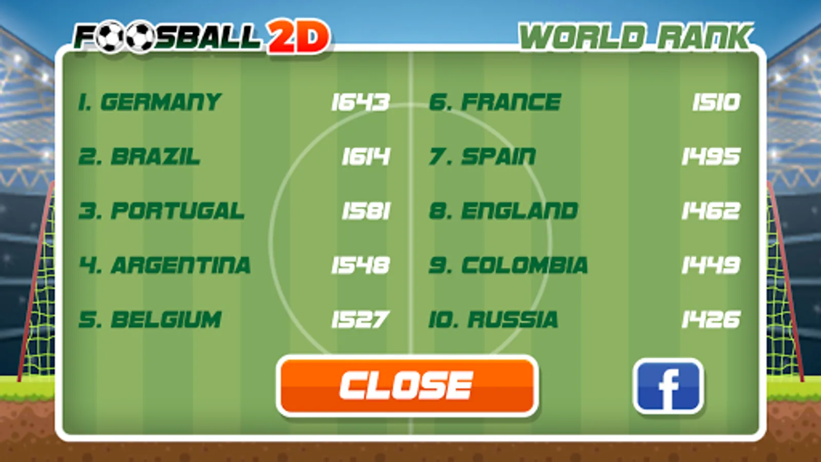 Choose your favorite team from top 10 world ranked country. Select your preferable stadium and win goal limit then start play and do battle on the stadium ground with our Foosball 2D.