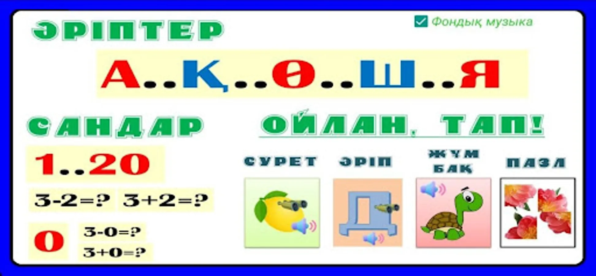 KAZAKHSHA ӘLIPPE https://play.google.com/store/apps/details?id=com.embarcadero.AlphabetNum2