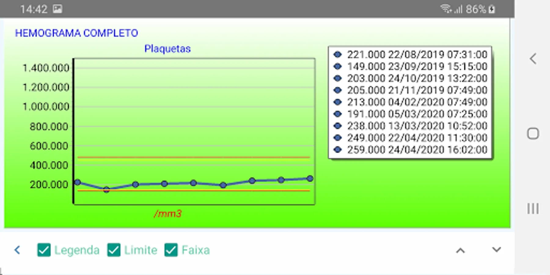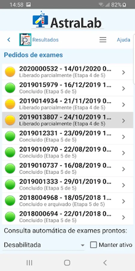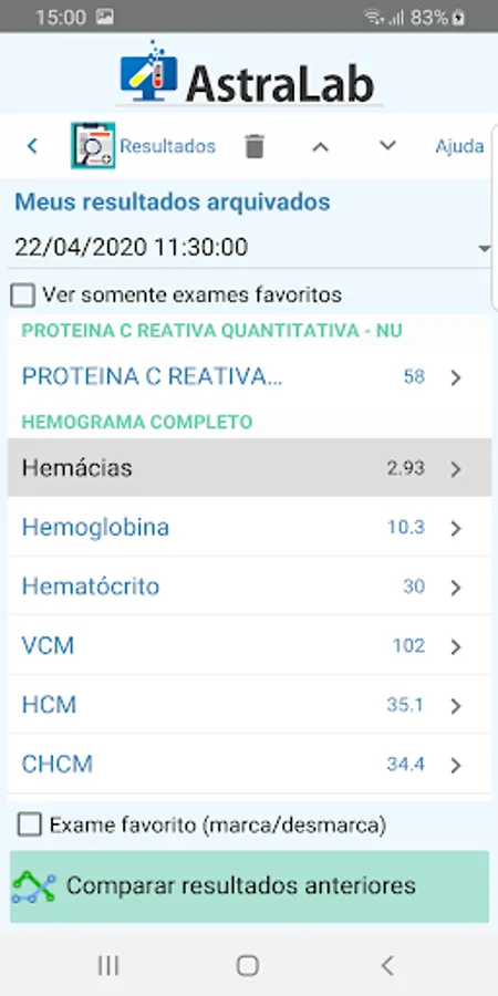- Record of the history of all exams performed by the patient with the possibility of indicating favorite exams, generation of comparative graphs of the exams performed on different orders and dates (histogram)