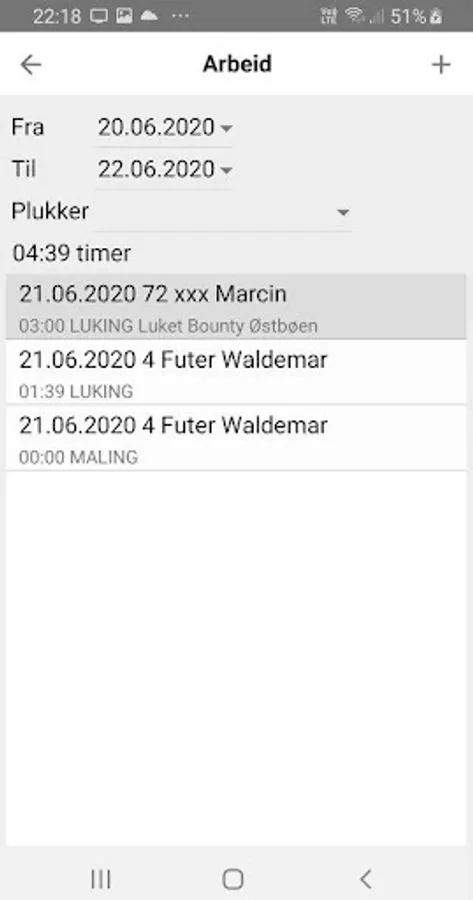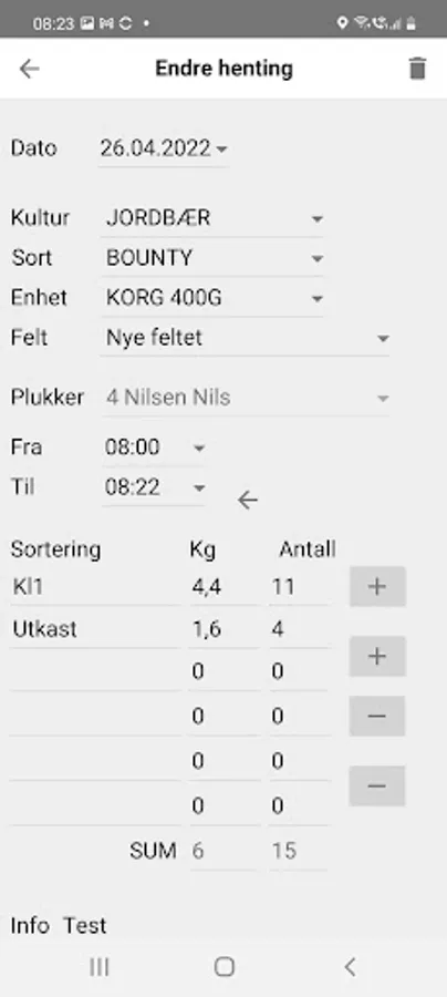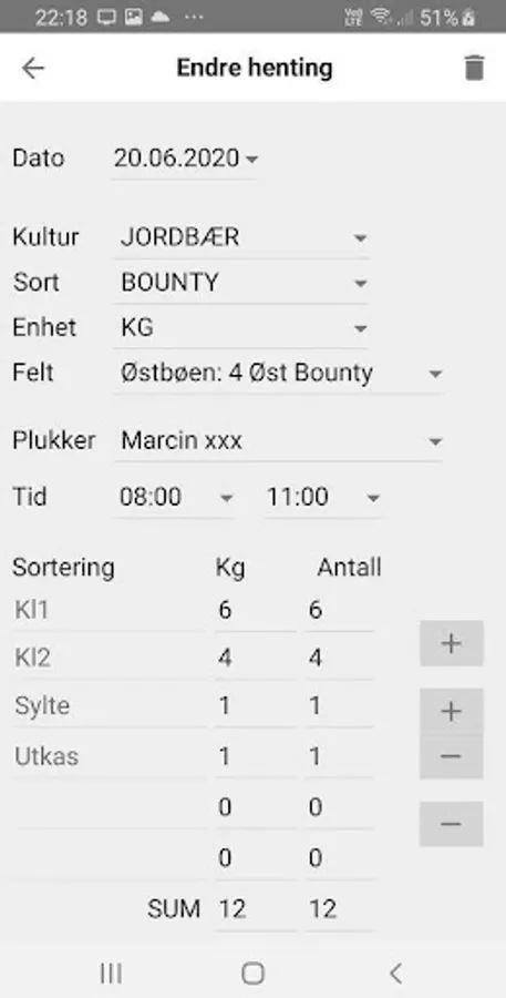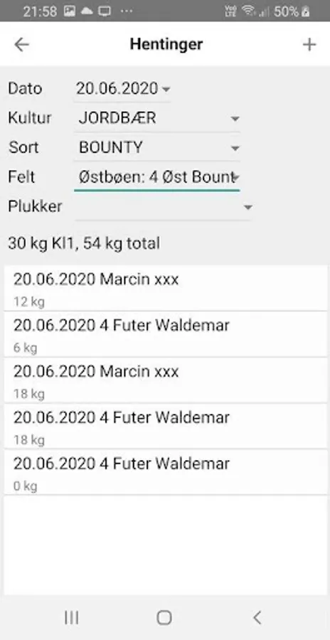 Record picking of pickers with variety, kg and field, and other work done by pickers. Data provides the basis for use in the PC version for profitability analysis, yield per field and salary calculation of pickers.