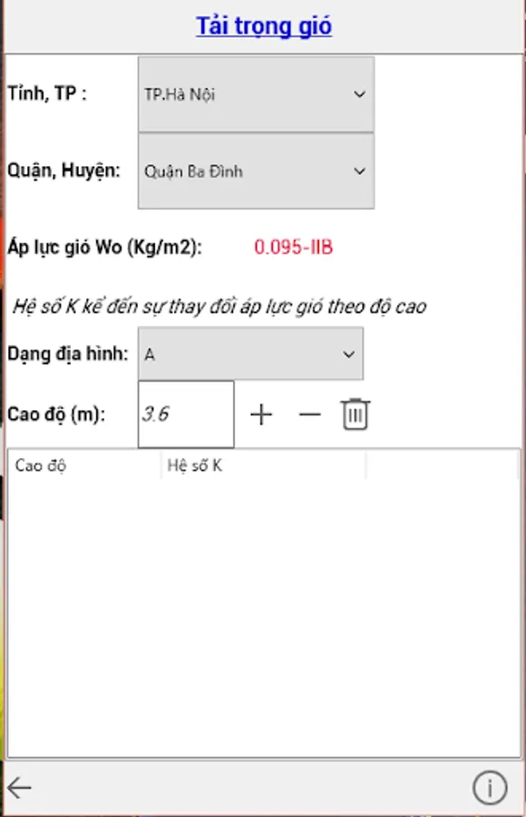 - Wind: There is a complete wind library of all cities and provinces in Vietnam, supporting calculation of interpolation coefficient K to the change of wind pressure in height.