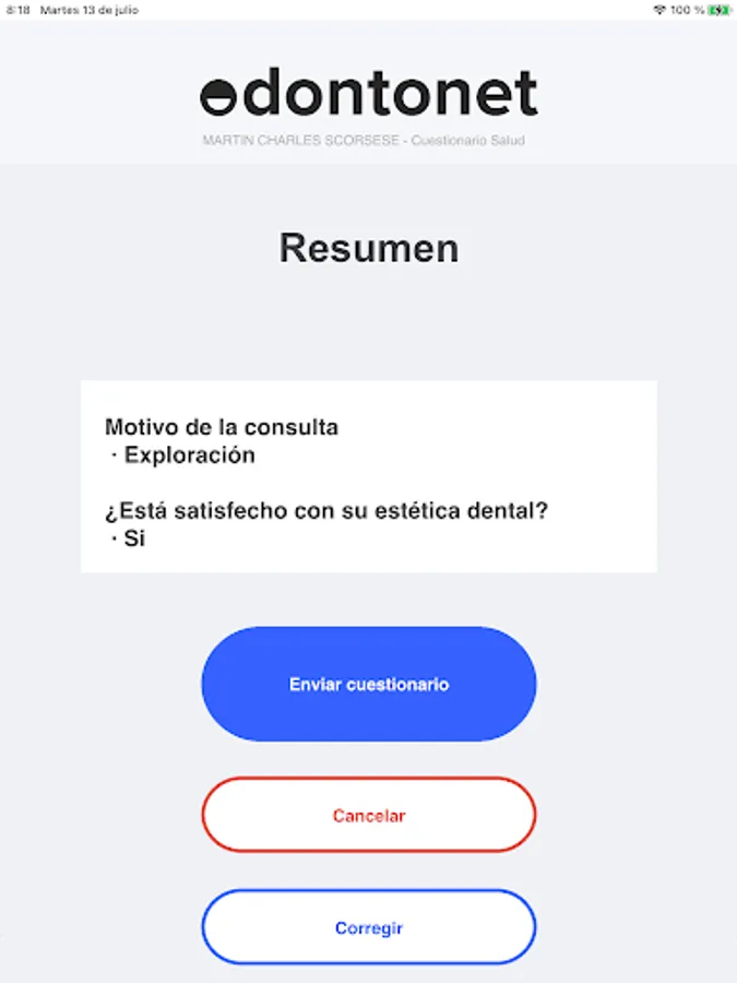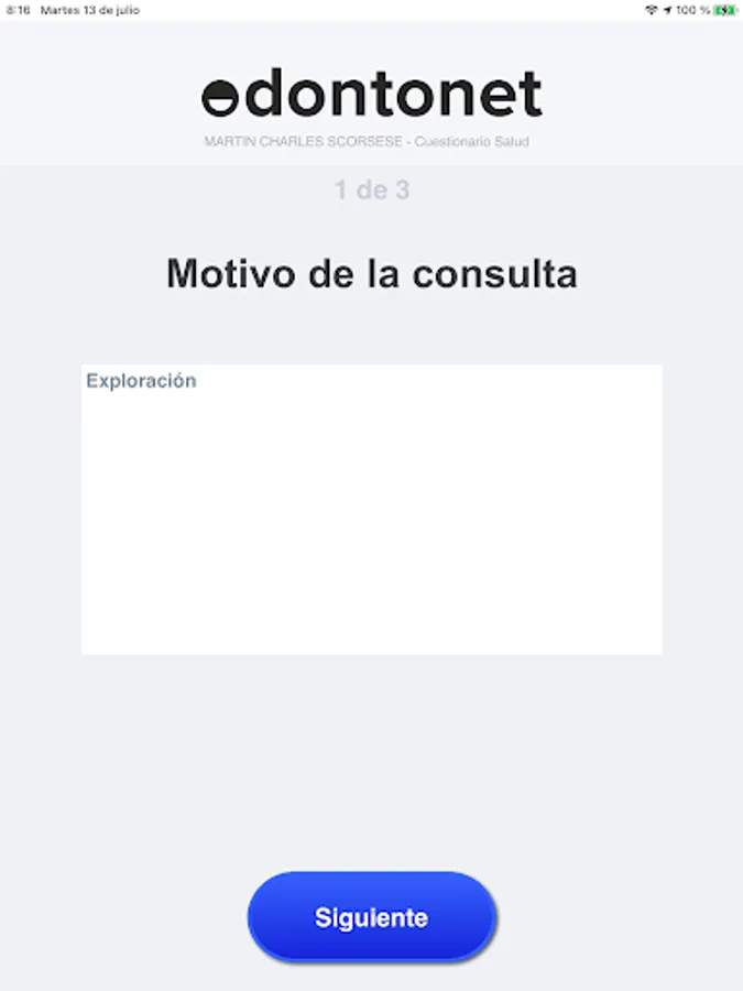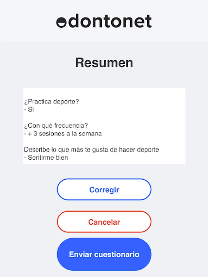 This application allows you to fill in any type of questionnaire that has previously been added and configured in Odontonet.
